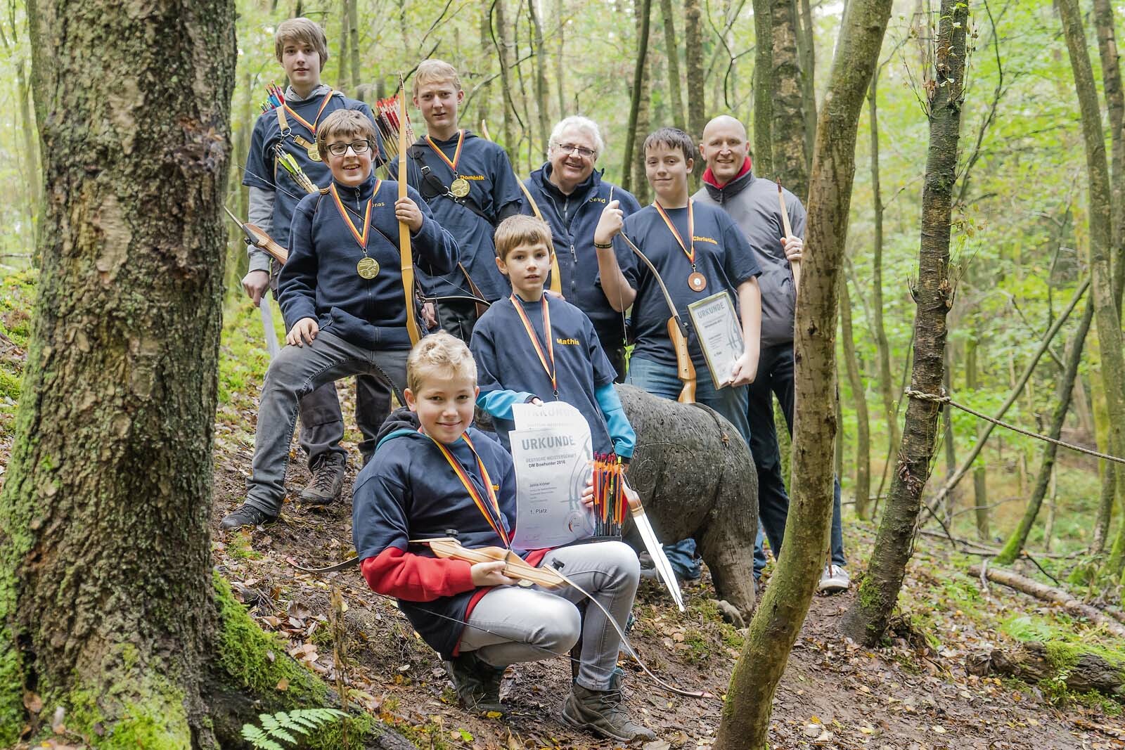 Was für eine Premiere: Zum ersten Mal teilgenommen und gleich mit fünf deutschen Meistertiteln heim in die Eifel gekehrt. Dieses Kunststück gelang den elf Bogenschützen aus dem »Team Bogenwerkstatt« um Trainer Devid Hörnchen aus Schöneseiffen, die an der Deutschen Meisterschaft im saarländischen Spiesen-Elversberg teilnahmen. In verschiedenen Bogen- und Altersklassen traten die Eifeler Bogenschützen gegen ihre Mitstreiter an und kehrten mit Medaillen und Urkunden erfolgreich wieder zurück. Fünf Mal Deutscher Meister, einmal Vizemeisterin und zwei dritte Plätze - so sah die überragende Bilanz der jungen Schützen aus. Und dabei waren die Bedingungen alles andere als leicht. Schwierige Bedingungen »Am Samstag goss es wie aus Kübeln, teilweise so stark, dass man seine eigenen Schüsse gar nicht mehr bis ins Ziel verfolgen konnte und deshalb gar nicht wusste, ob man nun getroffen hatte oder nicht«, berichtet Devid Hörnchen. »Aber keiner von uns hat aufgegeben, alle haben bis zum Schluss durchgehalten und kehrten klitschnass aus ihrem Parcours zurück!« Am Ende des ersten Tages belegte das Team fünf erste Plätze, zwei dritte Plätze und einen fünften Platz. Sonntags wurden die Gruppen nach den Ergebnissen vom Vortag neu zusammen gestellt. Bei sonnigem Wetter ging es dann in die zweite und entscheidende Runde. Es galt, Vorsprünge zu halten oder auszubauen bzw. Plätze gut zu machen. Auch dies gelang den jungen Teilnehmern in den meisten Fällen. Aufgeholt So arbeitete sich Christan Hohlmann vom 5. auf den 3. Platz hoch und gewann eine Bronze-Medaille. Kathrin Grümmer stieg bei den weiblichen Langbogenschützen vom 3. auf den 2. Platz gestiegen und wurde damit Deutsche Vizemeisterin. Jonas Hörnchen hatte bei den Primitiv-Bogenschützen am ersten Tag einen Vorsprung von gerade einmal 2 Punkten, konnte diesen jedoch auf 30 Punkte ausbauen und sich so den Titel Deutscher Meister sichern. Jannis Krömer lag in der Bogenklasse Traditional Bowhunter Recurve nach dem ersten Tag mit rund 30 Punkten Vorsprung vorne, baute auf genau 100 Punkte aus, was ihm ebenfalls den Titel einbrachte. Weitere Deutsche Meister-Titel holten Kerstin Kanzler, Daniel Meyer und Dominik Bock, Mathis Krömer gewann die Bronze-Medaille. »Bei den Erwachsenen merkt man, dass wir noch nicht so lange dabei sind«, sagte Devid Hörnchen. »Ich wurde am Ende Vorletzter von 22 Teilnehmern, Arndt Krömer wurde 34. von 47 Teilnehmern. Natürlich ist die Konkurrenz bei uns größer und an der Spitze wird es sehr eng. Aber es ging uns ja vor allem auch darum, einfach mitzumachen, Erfahrungen zu sammeln und eine gute Zeit zu haben.«