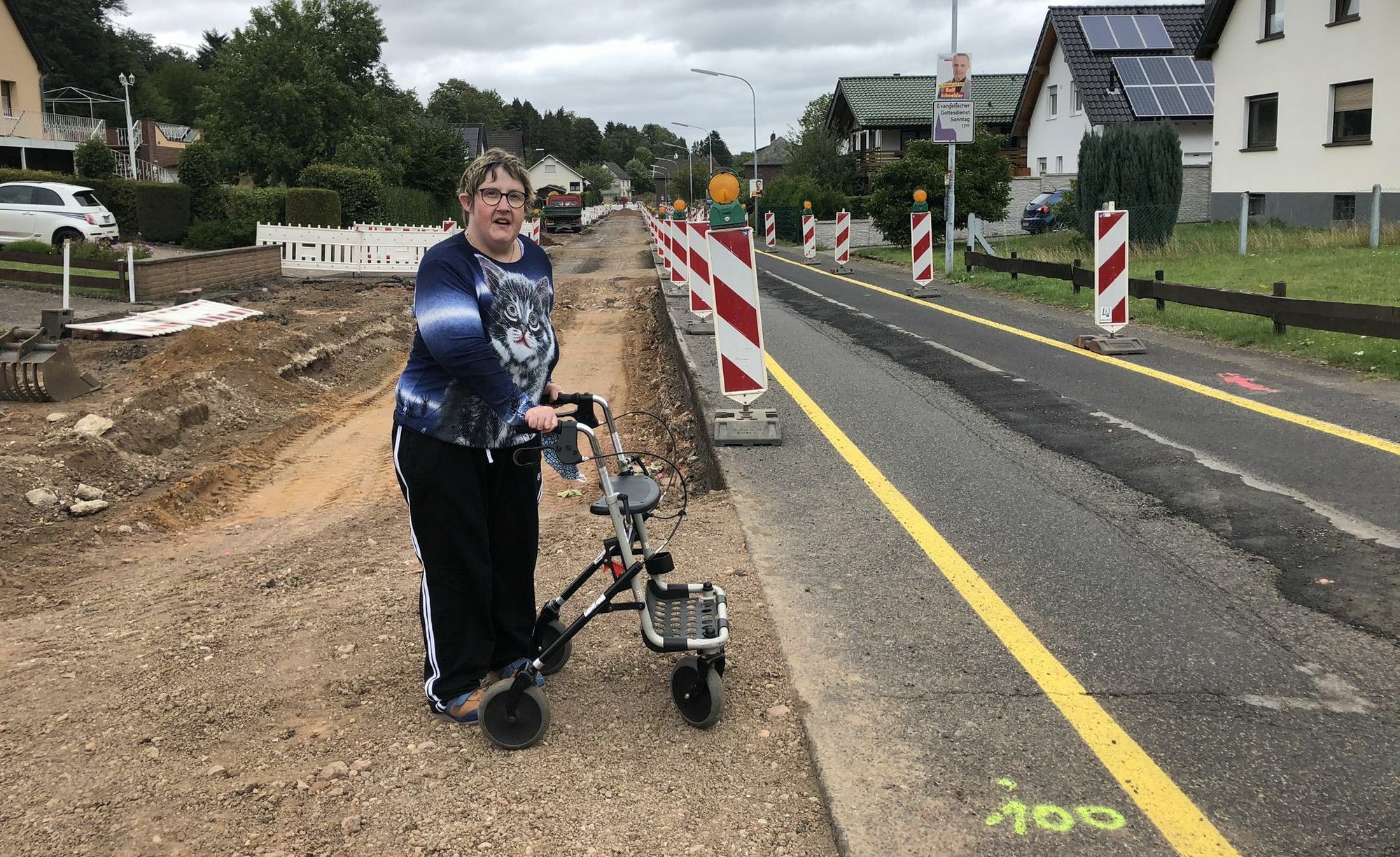 »Das ist sehr eng, da passe ich mit meinem Rollator kaum durch«, verweist sie auf den lediglich ein Meter breiten Gehweg, der den Fußgängern in der Aachener Straße am Ortsausgang Richtung Golbach derzeit zur Verfügung steht. Sie habe schon ein wenig Angst, so Andrea Braden weiter. Denn der Gehweg sei momentan lediglich mit einer durchgehenden gelben Linie sowie Baken vom fließenden Verkehr getrennt.