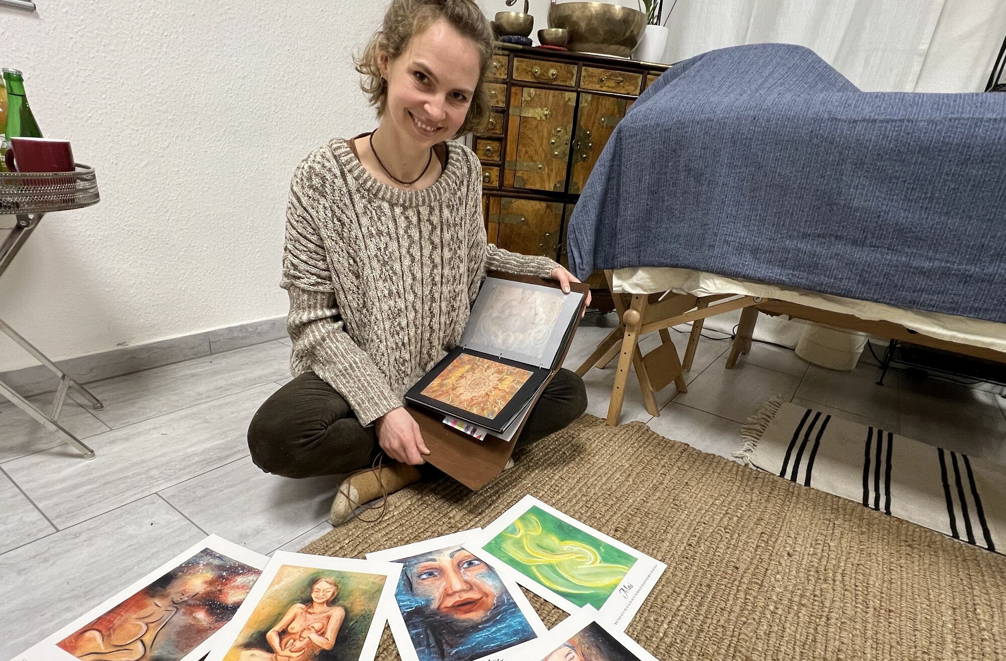 Die Künstlerin, die diese Kunstwerke mit Ölkreide geschaffen hat, heißt Katharina Scheld. Sie ist 31 Jahre alt, in Schleiden aufgewachsen und wohnt derzeit in Gemünd. Sie ist nicht in erster Linie Künstlerin, sondern ihr Hauptberuf ist Hebamme. »Ich arbeite allerdings nicht im klinischen Bereich, sondern habe mich nach einigen Jahren Berufserfahrung dazu entschlossen, ausschließlich Hausgeburten durchzuführen«, erzählt Katharina Scheld beim Treffen im Atelier »DaSein« in Mechernich.