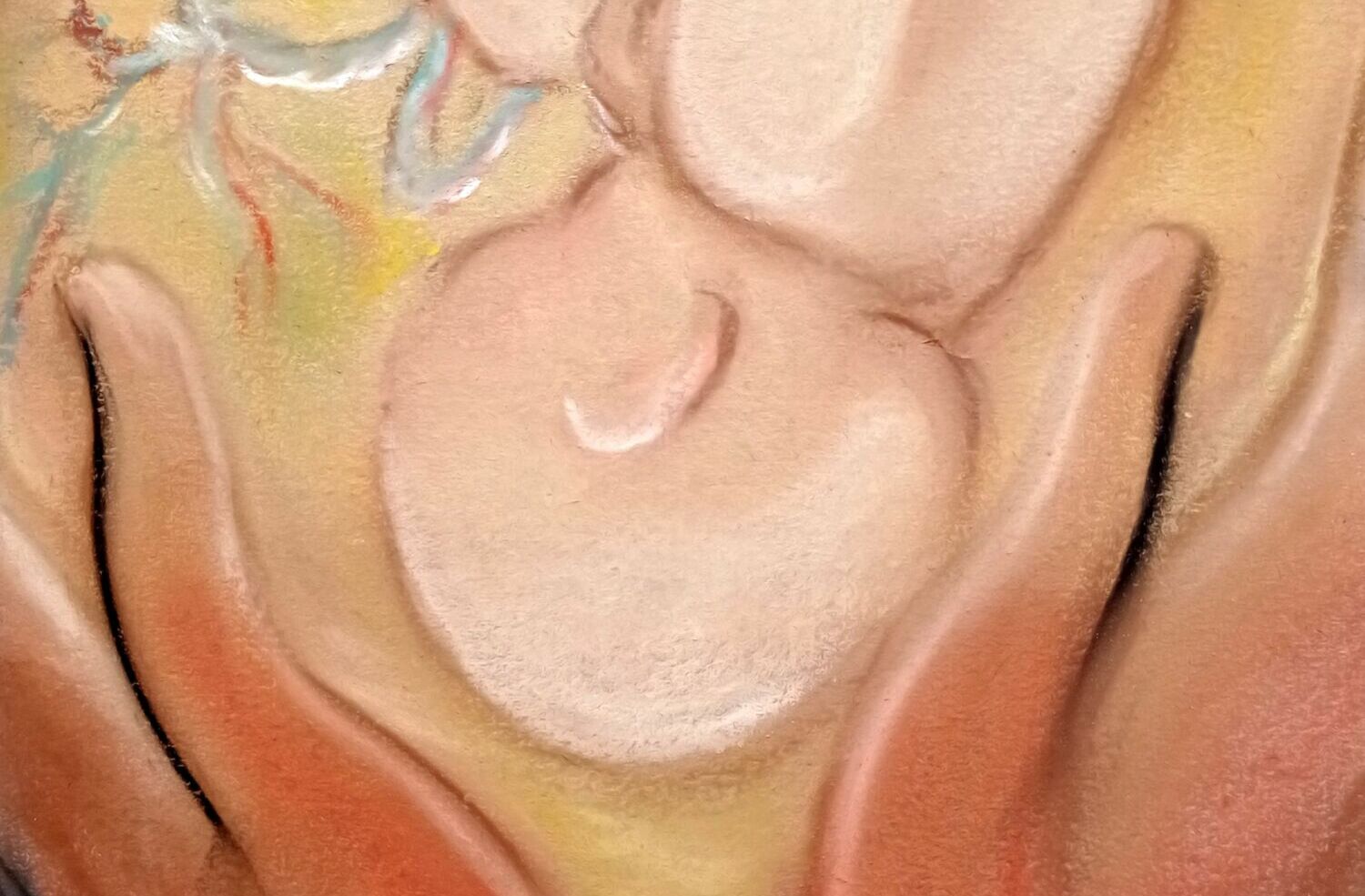 Und so verfiel sie auf die Idee, ihre persönlichen Eindrücke von jeder Geburt mit Ölkreide festzuhalten. »So ein Bild«, so die Hebamme, »sagt tatsächlich mehr als tausend Worte. In ihm sind Gefühle und Gedanken auf einen Blick sichtbar.« Eine künstlerische Vorbildung hat sie nicht, malt aber schon seit der Schulzeit sehr gerne. Wenn sie in der Stimmung ist, setzt sie sich auf den Boden und bringt die Bilder, die vor ihrem geistige Auge auftauchen, zu Papier. »Das dauert eigentlich nie lange. Wenn ich mich hinsetze, dann fließt es aus mir heraus«, erzählt Katharina Scheld, die ihre Bilder auch nicht nachbearbeitet, um sie zu perfektionieren.