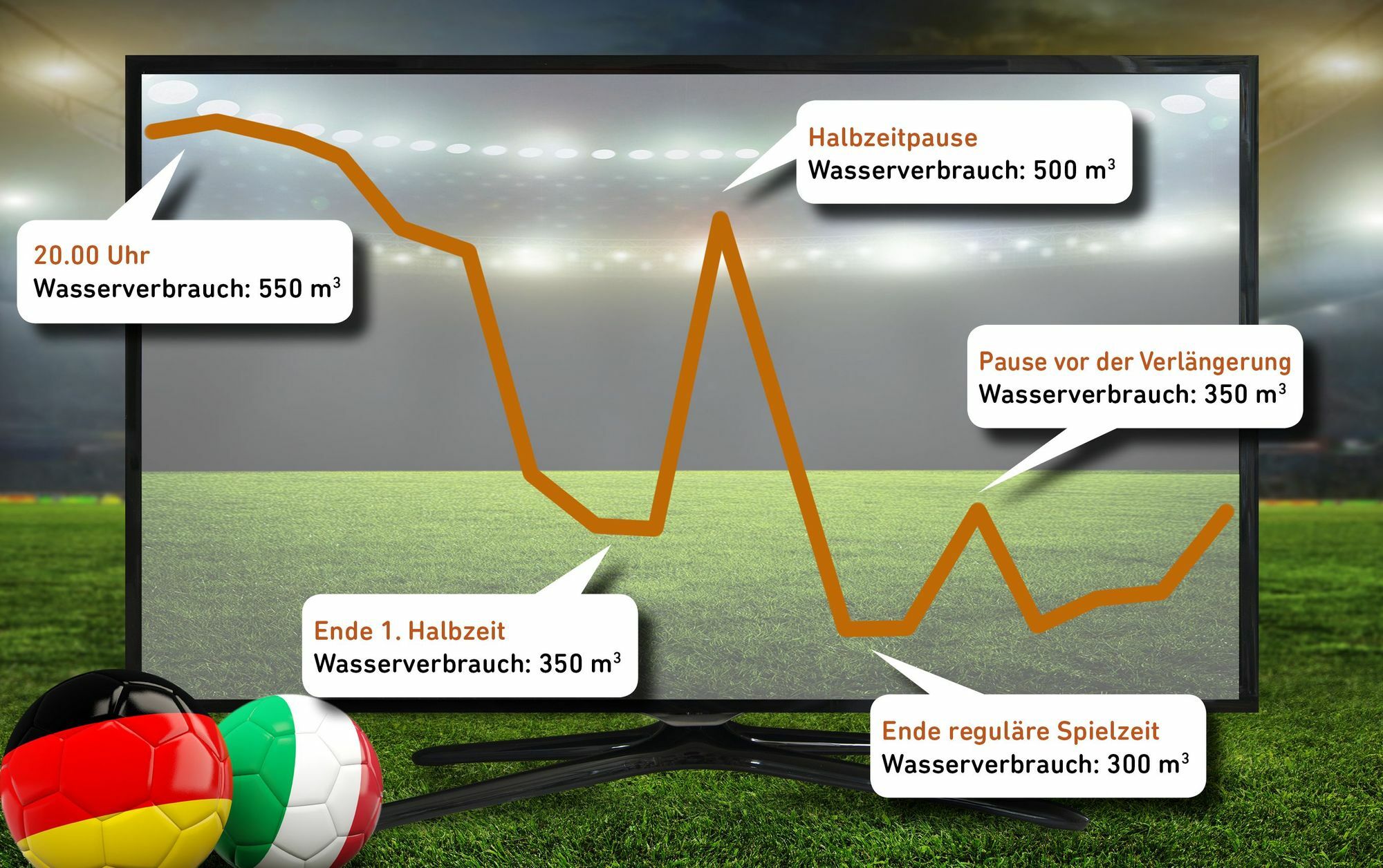 Pünktlich zu den Nationalhymnen sitzen die Fans in Euskirchen und Swisttal vor dem Fernseher, in der Kneipe oder beim Public Viewing – aber nicht auf der Toilette. Das zeigt jedenfalls die Wasserverbrauchskurve von e-regio für den Samstagabend. Pünktlich zum Anpfiff des Viertelfinalspiels gegen Italien sank um 21 Uhr der Verbrauch in den beiden Kommunen rapide ab. „Liegt die Abgabe der drei für die Gemeinden zuständigen Wasserwerke eine Stunde vor dem Spiel noch bei ca. 550 Kubikmetern pro Stunde, fließen gegen Ende der ersten Halbzeit nur noch 350 Kubikmeter durch die Rohre. Sobald Jogis Jungs in die Kabine verschwinden, suchen auch die Fans ein stilles Örtchen auf. Die Folge: Der Wasserverbrauch steigt wieder sprunghaft an, auf rund 500 Kubikmeter. Zur zweiten Halbzeit fällt der Verbrauch in Sekundenschnelle wieder ab. Dass diese richtig spannend wird und die Fans auf ein weiteres Tor für Deutschland in der regulären Spielzeit hoffen, sieht man auch in der Kurve: Tiefststand auf fast der Hälfte des Verbrauchs mit gerade mal 300 Kubikmetern. Vor der Verlängerung steigt der Verbrauch nur marginal und sinkt direkt wieder. Jetzt auch noch Elfmeterschießen, spannender geht es ja kaum. Die wenigen Minuten bis zur Entscheidung traut sich wohl kaum jemand, seinen Platz nochmal zu verlassen und erst nach 0 Uhr setzt mit dem Sieg allgemeine Erleichterung auf allen Ebenen ein“, heißt es in einer aktuellen Mitteilung. Dieses Auf- und Ab stellt für e-regio eine Standardsituation dar. Die insgesamt elf Trinkwasserpumpen können je nach Bedarf computergesteuert zu- oder abgeschaltet werden. So wird der Wasserdruck immer auf dem gleichen Level gehalten. Der Regelbetrieb sieht lediglich vier bis fünf Pumpen vor. Die Kapazitäten seien also durch ein solches Ereignis bei Weitem nicht ausgeschöpft, so die e-regio. Zusätzlich schieben stets Mitarbeiter Bereitschaftsdienst. Sie können bei Unregelmäßigkeiten sofort eingreifen. Für den Fall, dass die DFB-Elf ins Finale einzieht und noch mehr Fans zuschauen: Selbst wenn alle zur gleichen Zeit die Toilettenspülung nutzen, sei laut e-regio genug Wasser im Netz. Seit 2014 ist e-regio Betriebsführer der Wasserversorgung in der Stadt Euskirchen und der Gemeinde Swisttal und beliefert rund 76.000 Einwohner mit Trinkwasser. In den Wasserwerken Arloff, Heimerzheim und Ludendorf wird das Wasser auf Trinkwasserqualität aufbereitet und über ein kontinuierlich gewartetes Leitungsnetz zuverlässig ins Haus geliefert. Auch in Alfter ist e-regio für die Wasserversorgung zuständig. Grafik: e-regio