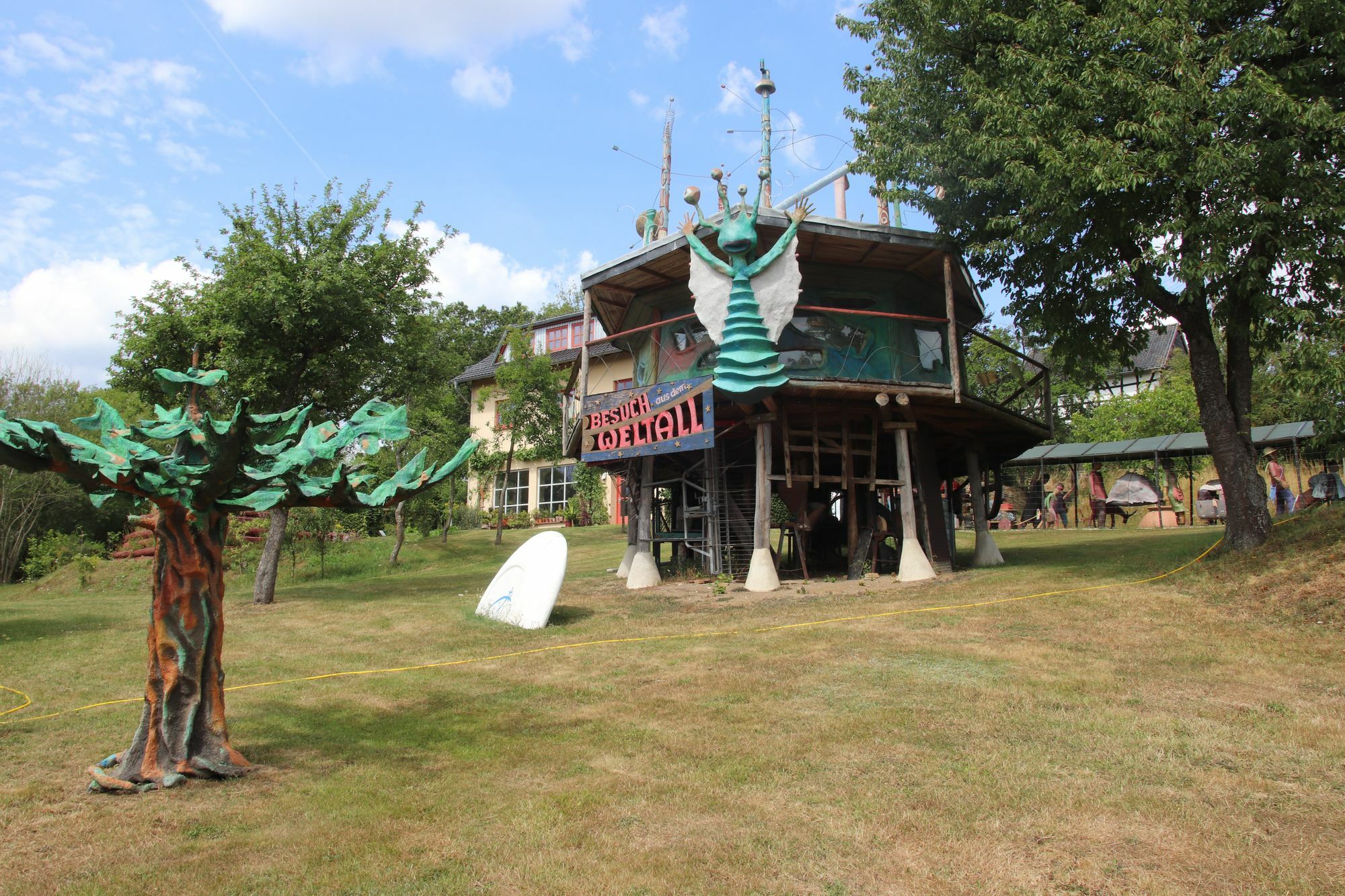 Wie Blüten sprießen seine eigenwilligen Ideen auf jedem Meter aus der Landschaft rings um seinen Bauernhof. So steht mitten auf der Wiese vor dem Haus ein großes Ufo aus Holz. Bunt angemalt und mit einem gläsernen Kuppeldach thront es in der Landschaft wie frisch gelandet.