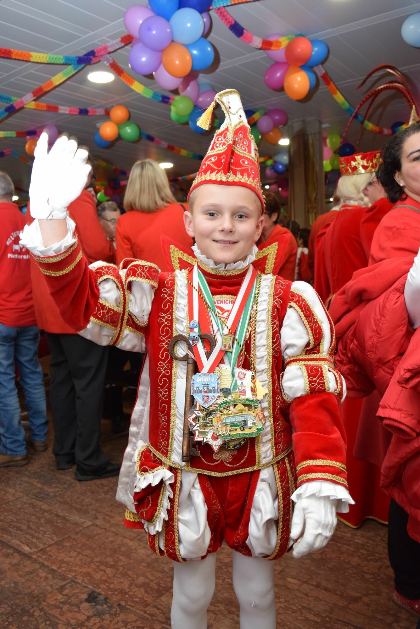 So ergab sich ein buntes Bild aller Tollitäten einer Gemeinde oder Stadt auf der Bühne. Viele brachten neben ihrem Motto auch ein Lied mit und sorgten damit für Stimmung im Kreishaus. So gab beispielsweise Prinzessin Kerstin I. (Walber-Wawer) von der KG Löstige Bröder aus Kall eine Version von »Mer sin eins« der Kölsch-Rock-Band Kasalla zum Besten. Wenn die Tollitäten das musikalische Programm nicht gerade selbst bestimmten, sorgte Werner Krebs, der Fahrer des Landrats, für kölsche Tön.