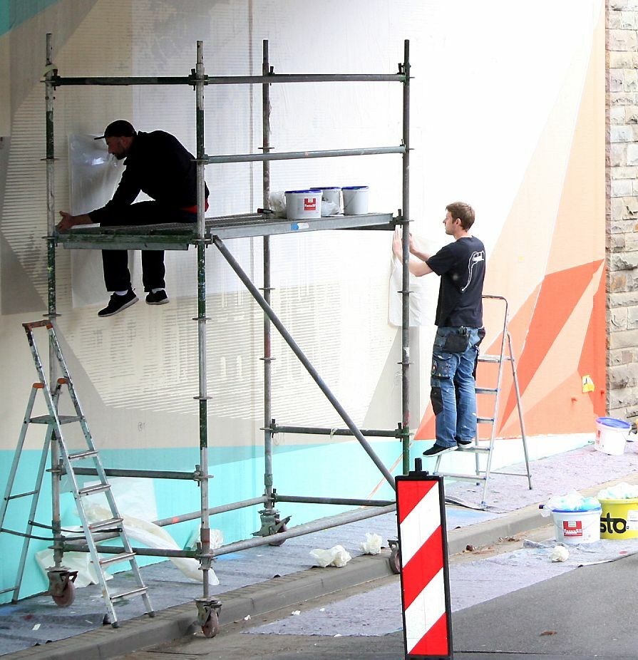 Das gerasterte Bild wird daraufhin in eine Folie gestanzt, so dass die Linien per Hand mit einem Skalpell herausgelöst werden können. Das fertige Motiv wird dann auf die Fassade geklebt und mit Acrylfarbe besprüht. »So können wir schnell und wirkungsvoll ein Bild entstehen lassen«, erklärte Stefan Vogt. Zusätzlich zu den historischen Ansichten aus Kall soll an der Unterführung unterhalb des Fußgängerwegs ein Willkommensgruß zu sehen sein, der aus zwei Händen und dem Schriftzug »Willkommen« in mehreren Sprachen besteht. Um die Kosten für die Kommune gering zu halten, hat der Bauhof die Säuberung und Vorbereitung der Wandflächen vorgenommen. Wenn die Spraykünstler fertig sind, soll der Bauhof zudem eine Schutzschicht über den Bildern auftragen, die nicht nur vor Moosbefall und UV-Strahlen schützt, sondern auch Schmierereien leichter entfernen lässt.