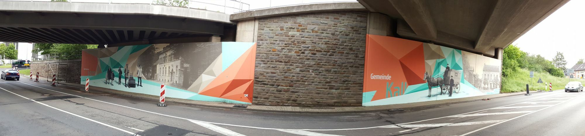 Jetzt prangen auf der einst grauen Betonwand bunte Dreiecksformen und alte Ansichten aus Kall - den Spraykünstlern der Bonner Firma »Highlightz« sei dank. Sie gestalteten die Unterführung neu. Die Motive, die historische Ansichten zeigen, wählten die Künstler gemeinsam mit der Kaller »Arbeitsgemeinschaft Graffiti« und dem Kaller Chronisten Hubert Büth aus. Zur Arbeitsgemeinschaft zählen die Mitglieder aller Fraktionen sowie einige engagierte Bürger, die verschiedene Motive aussuchten, die Hubert Büth bereits in seiner Chronik »Kall im Spiegel der Geschichte« veröffentlicht hat.