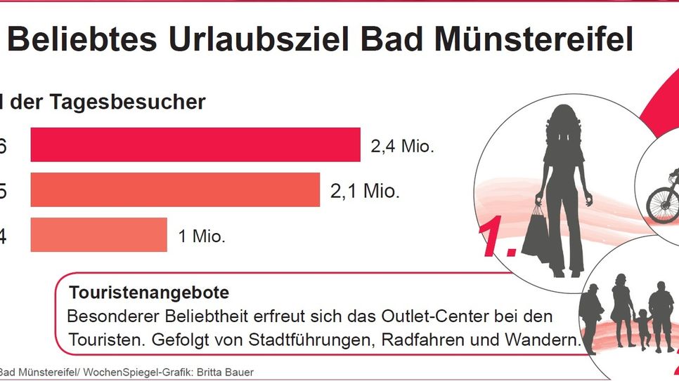 Das tun jedenfalls nach einer WochenSpiegel-Umfrage einige Touristen. Dirk und Esther Pyro treffen wir unterhalb des Kurhauses an. Offensichtlich hat das Paar aus Wesseling seinen eintägigen Shopping-Trip mit einer Tour durch den Kurgarten Wallgraben verbunden. »Wir waren schon häufiger hier und wir kennen keine andere Stadt, in der man so gemütlich einkaufen und gleichzeitig die Natur genießen kann«. Erschöpft auf einer Bank vor dem St. Michael-Gymnasium sprechen wir die Familie Knebel aus Siegburg an. »Wir waren auf der Suche nach Heino und haben ihn auch gefunden - allerdings weiter weg als vermutet. Sein Café im Kurhaus ist isoliert von der Kernstadt, das finden wir schade. Nach einer tollen Wanderung entlang der Stadtmauer sind wir dann hier gelandet«. Bevor es später nach Hause geht, wollen Mutter, Sohn und Schwiegertochter dann noch Schnäppchen schlagen. Unweit der Familie Knebel kommen Klaus und Lena Schmitt aus Homburg mit dem Motorrad angefahren. »Wir sind auf Durchreise durch die schöne Eifel. Bad Münstereifel wurde uns für einen Stopp empfohlen. Wir hoffen, einen leckeren Kaffee trinken zu können und vertreten uns die Füße«. Aus Offenburg im Südwesten Deutschlands sind Cordula Münzer und Gabriele Lamsal angereist. »Wir besuchen Freunde und finden die Stadt mit dem vielen Fachwerk toll. Bis Mittwoch bleiben wir hier und wollen Shopping mit Kultur vereinbaren«, sind sich beide einig. Eine wesentlich kürzere Anfahrt hatte Wolfgang Hensch aus Kall-Keldenich. »Münstereifel ist klasse für einen kurzentschlossenen Shopping-Trip. Anfangs war ich sehr skeptisch, doch das Outlet hat der Stadt wieder Leben eingehaucht«.