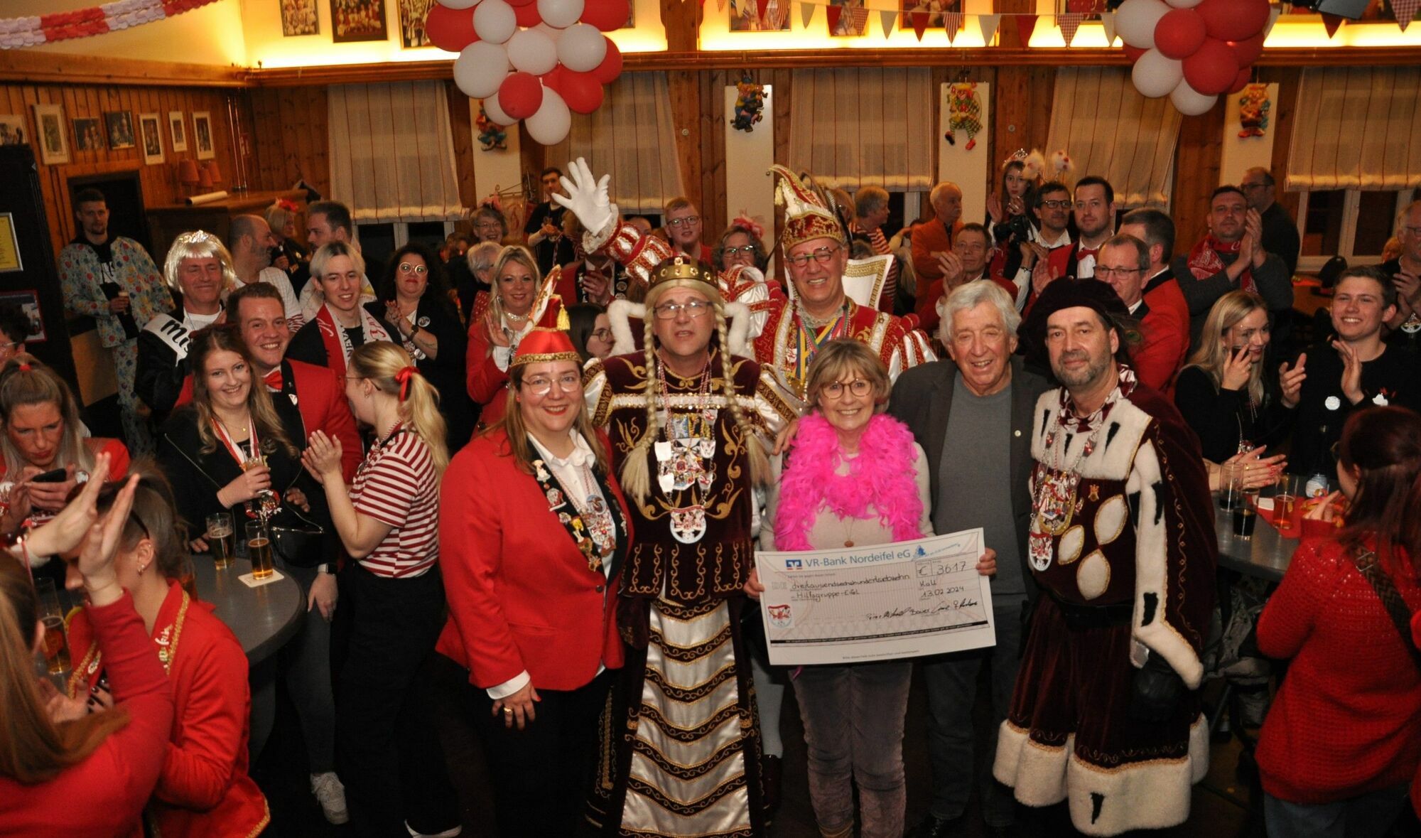 Einen ganz besonderen Grund zum Danke sagen hatte an diesem Abend der Vorsitzende der Hilfsgruppe Eifel, Willi Greuel. Er war mit seiner Gattin Kathi beim Bye-Bye-Abend erschienen, um eine Spende des Dreigestirns entgegenzunehmen. Michael Schulz, Uwe Walber und Markus Walker hatten während der Session Pins und Aufkleber zugunsten der Hilfsgruppe verkauft. Die Aktion zog große Kreise und fand in der närrischen Szene ein großes Echo.