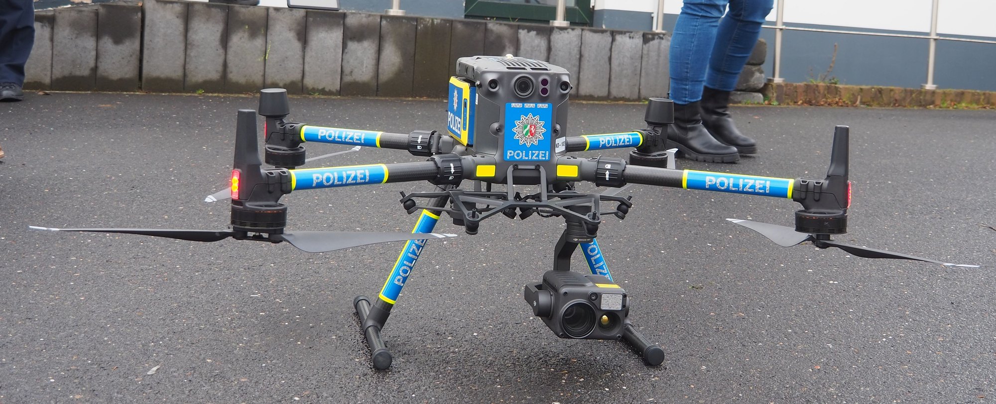 Sieben Kilogramm, Wärmebildkamera, Laserentfernungsmesser, bis zu 43 Minuten Flugzeit – und das auch noch bei Regen und in der Nacht. Die Kreispolizeibehörde Euskirchen hat eine neue Profi-Drohne vom Typ DJI Matrice 300 RTK, kurz M300, erhalten. Das Landesamt für Zentrale Polizeiliche Dienste (LZPD) NRW stellte das rund 23.000 Euro teure Gerät dem spezialisierten Verkehrsunfallaufnahmeteam (VU-Team) der Behörde zur Verfügung.