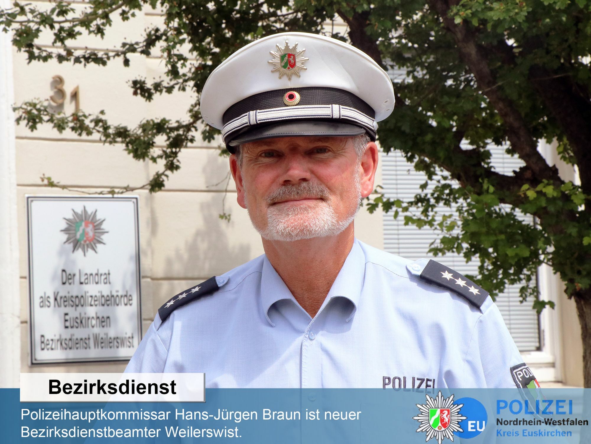 Hans-Jürgen Braun ist 56 Jahre alt und wohnt in der Gemeinde Weilerswist. Sein Spitzname »Bruno« stammt von seiner aktiven Zeit als Fußballer des SSV Eintracht Lommersum, wo er auch als Trainer tätig war. Braun ist nach seinem Wechsel vom Bundesgrenzschutz seit 1990 Polizeibeamter des Landes Nordrhein-Westfalen. Nach verschiedenen Stationen in Bonn, wurde er 1998 nach Euskirchen versetzt, wo er bis September 2017 im Streifendienst tätig war. Anschließend wechselte er in den Bezirksdienst nach Euskirchen. Jetzt hat er diese Tätigkeit in seiner Heimatgemeinde übernommen. »Ich freue mich auf diese Aufgabe und stehe mit meinem Kollegen Hans-Werner Braß gerne als Ansprechpartner für die Fragen und Belange der Weilerswister Bürger zur Verfügung«, sagt Braun. Die Wache des Weilerswister Bezirksdienstes befindet sich im Weilerswister Rathaus, Bonner Straße 31. Telefonisch ist der Bezirksdienst Weilerswist unter 02254/844999 zu erreichen. In dringenden Fällen ist der Polizeinotruf 110 zu wählen.