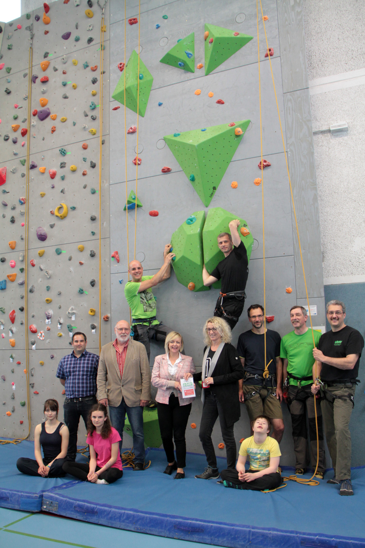 Jo Wildenberg (oben, v.l.) und Tameer Eden haben die Routen auf die neue Kletterwand geschraubt. Max Theißen (2.v.l. stehend), erster Vorsitzender des DAV Schleiden/Eifel, bedankte sich für die gute Zusammenarbeit bei Bürgermeisterin Sabine Preiser-Marian (3.v.l) und bei Rita Witt (4.v.l.) von der KSK Euskirchen. Foto: epa