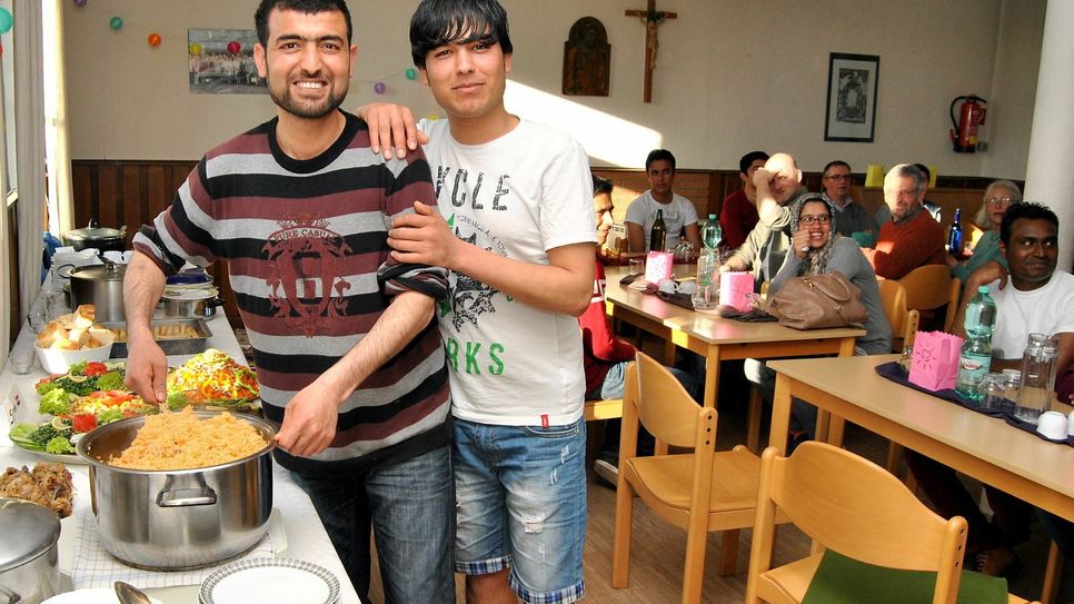 Immer wieder rührt Aynullah Nayimi im großen Topf auf dem Herd im Strempter Pfarrheim. Der junge Mann aus Afghanistan hat Qabili Palau gekocht, ein Festtags- und Nationalgericht aus seiner Heimat, für das er Reis mit Möhren, Rosinen, Mandeln und Huhn geschmort hat. Als die Gäste – andere Flüchtlinge aus dem Stadtgebiet Mechernich und Strempter – nach und nach eintreffen und das internationale Büfett eröffnet wird, besteht Aynullah Nayimi darauf, sein Essen eigenhändig auszuteilen.