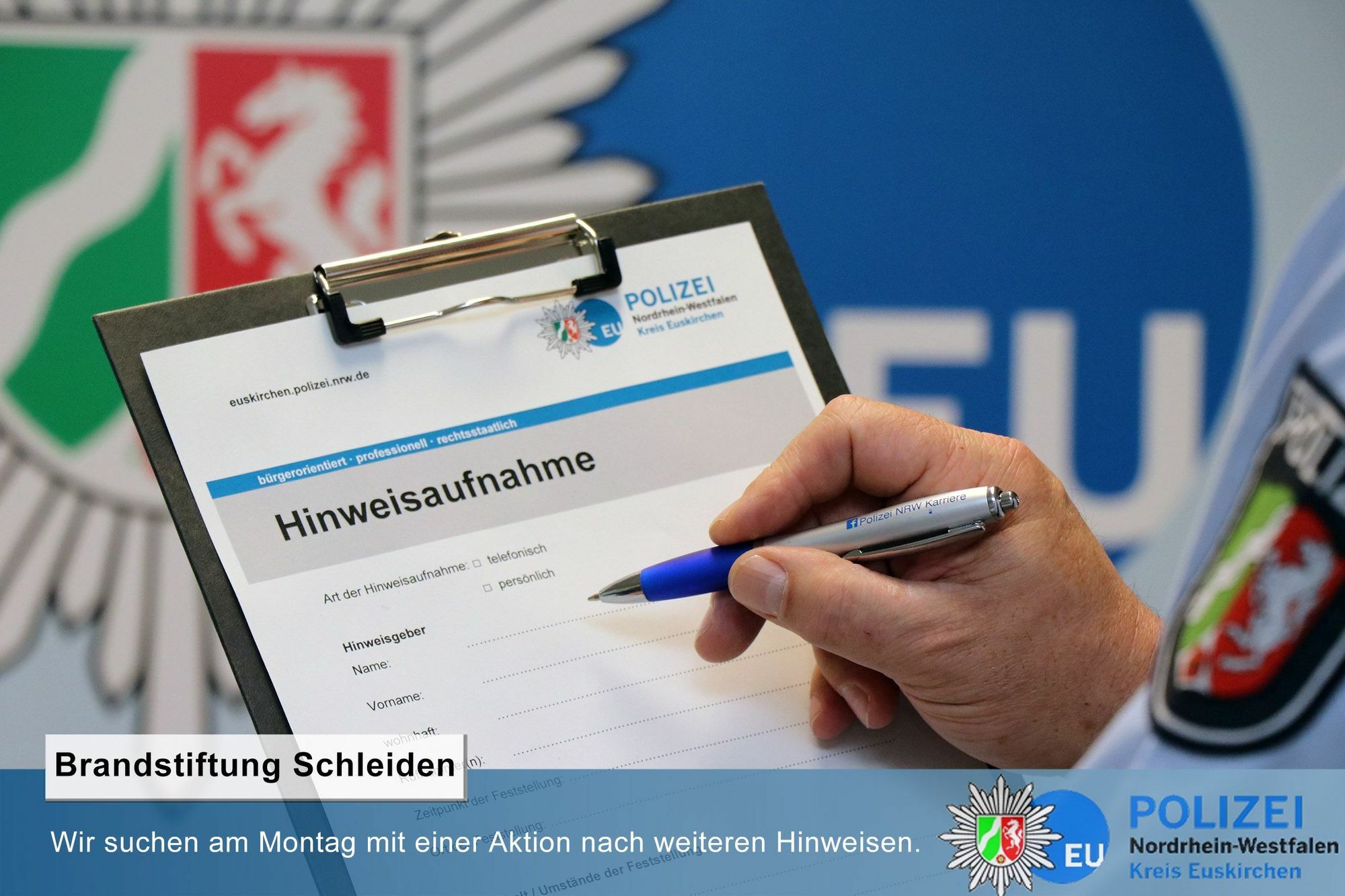 Die Ermittler interessiert insbesondere, ob während der jeweiligen Brandzeiten am 15./16. November und 4. Dezember Auffälligkeiten im Bereich des Brandortes an der Blumenthaler Straße festgestellt wurden. Die Fragen richten sich auch weiterhin auf Hinweise zur Identität des auf den Fahndungsfotos und Videosequenzen sichtbaren Tatverdächtigen. Auch Hinweise zur auffälligen Jacke der abgebildeten Person werden erbeten. Die Polizei Euskirchen fragt weiterhin: Wer kennt Personen, die eine solch auffällige Jacke tragen oder seit dem Brandgeschehen nicht mehr tragen? Parallel zu den Befragungen stehen für weitere Hinweise an beiden Gymnasien, der Realschule, im Innenstadtbereich Schleiden und auf dem Parkplatz des Mobau-/REWE-Marktes, "An der Olef", stationäre Polizeiliche Anlaufstellen zur Verfügung. Telefonische Hinweise bitte weiterhin an die Kriminalpolizei Euskirchen Telefon 02251 / 799-525 oder 799-0 oder jede Polizeidienststelle.