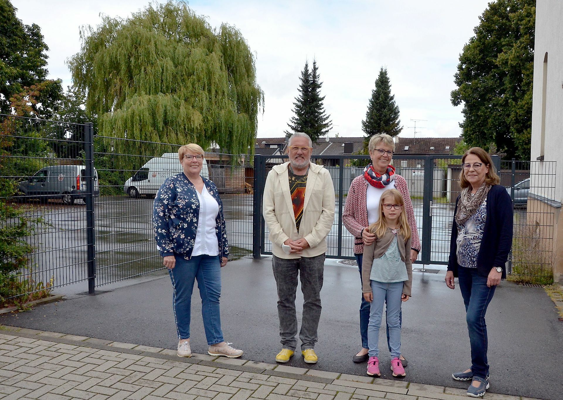 Die Veranstalter des Benefizkonzerts (v. l.): Magret Eich, Reinhard Kijewski, Maria Jentgen mit Enkelin und Petra Himmrich vor dem Veranstaltungsort. Auf dem Alten Schulhof „Im Sande“ sollen 450 Menschen zugunsten der Hochwassergeschädigten feiern und spenden. Foto: Henri Grüger/pp/Agentur ProfiPress