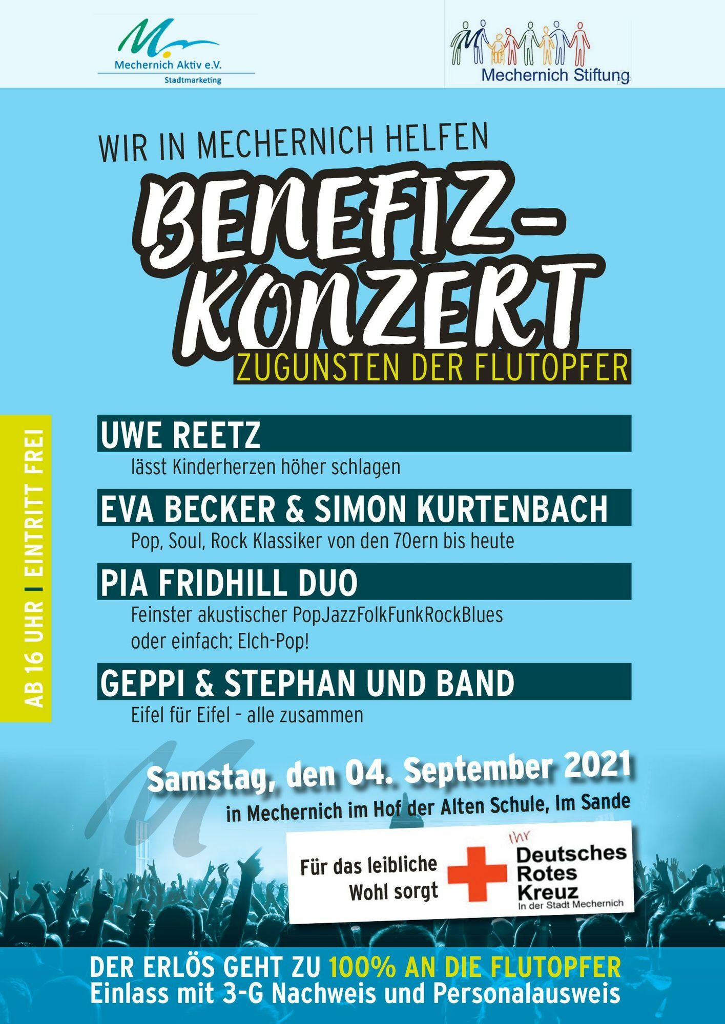Der Stadtmarketingverein "Mechernich Aktiv" lädt zu einem Benefizkonzert für die Hochwasseropfer am Samstag, 4. September, ab 16 Uhr hinter der Alten Schule „Im Sande“ in Mechernich ein. Mit dabei sind Uwe Reetz, Pia Fridhill und Jens Hoffmann, „Geppie, Stephan und Band“ sowie von Eva Becker. Alle Einnahmen gehen unbürokratisch an die Mechernich-Stiftung.