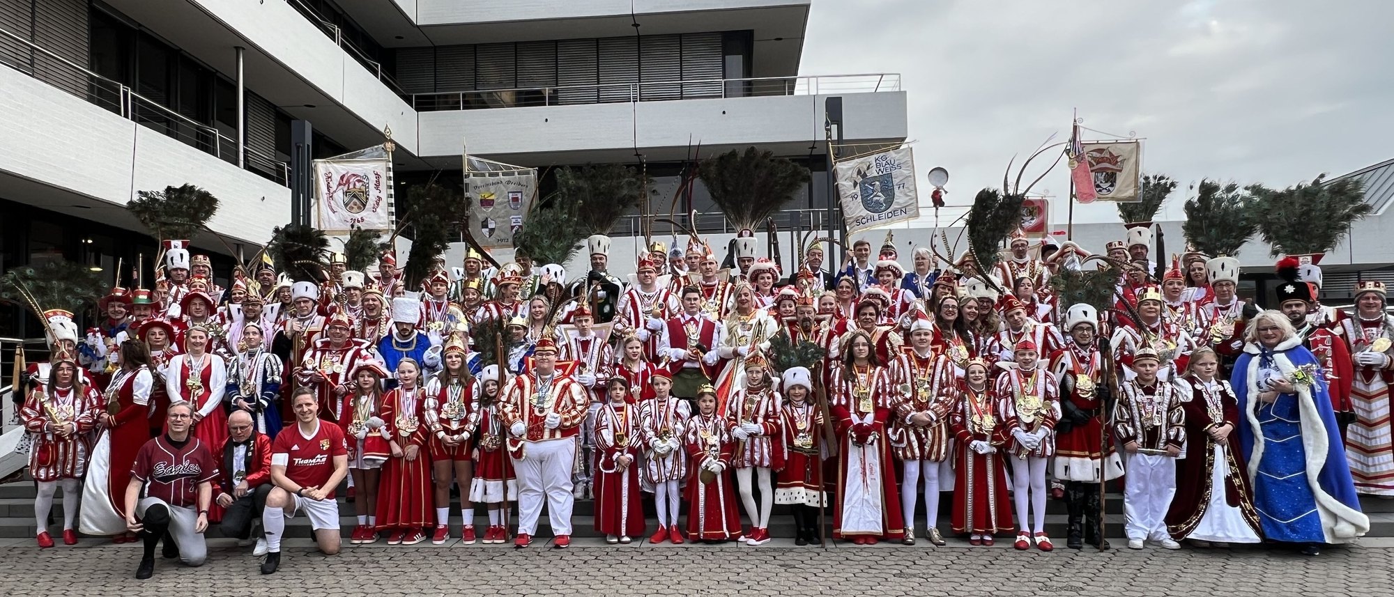 Insgesamt hatten sich 44 Karnevalsvereine angemeldet – von den hohen Eifelhöhen bis hinab in die Börde. Landrat Markus Ramers und sein Allgemeiner Vertreter Achim Blindert erwarteten sechs Prinzen, vier Prinzessinnen, fünf Prinzenpaare und 13 Dreigestirne. Beim großen Karnevalisten-Gipfeltreffen im Kreis Euskirchen hieß es für rund 60 Tollitäten: »Do simmer dabei«. Und sie sorgten nicht nur mit prächtigem Ornat für ein buntes Bild, sondern auch für ganz viel Stimmung.