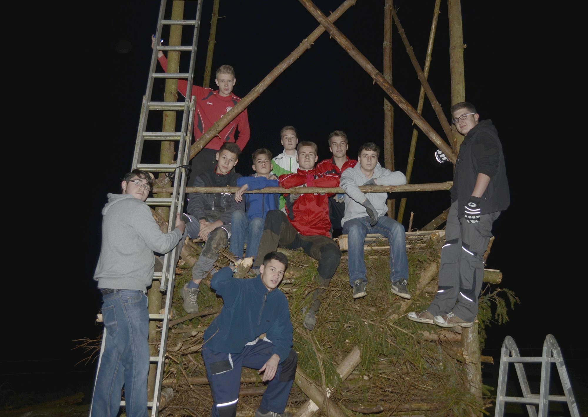 »Wir«, verrät Jan Griskewitz, »schichten das Holz zu einem Turm auf.« Dazu werden vier lange Stangen in einem Quadrat in die Erde eingelassen und mit Querstreben gesichert. In das Innere schichten die Jugendlichen dann das Holz, das sie zuvor im Wald eingesammelt haben. Letztes Jahr haben die Jugendlichen den Turm in eine Höhe von 7,50 Meter wachsen lassen. »In diesem Jahr«, verraten sie, »wollen wir eine Höhe von zehn Metern erreichen.« Kein Wunder, denn das diesjährige Martinsfeuer ist ein besonderes. »Zwar haben wir früher auch das Feuer gebaut«, so Jan Griskewitz. Nur war man da als Jugendgruppe organisiert. In diesem Jahr tritt man erstmals als »Junggesellenverein Olef« auf, dessen erster Vorsitzender Jan Griskewitz ist.