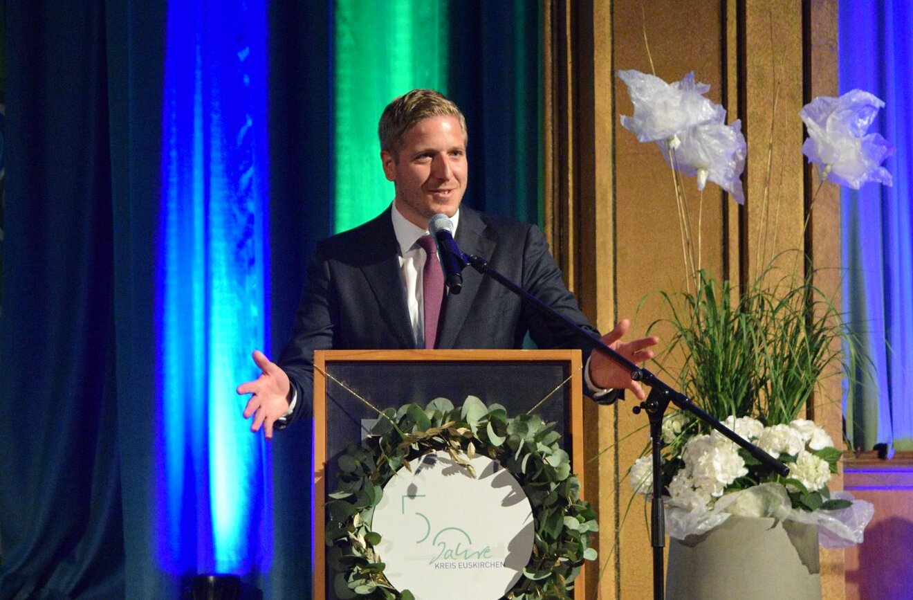 »Die damals ‚von oben‘ verordnete politische Fusion der beiden Altkreise Schleiden und Euskirchen war keine Liebesheirat, eher eine Vernunftehe«, sagte Landrat Markus Ramers in seiner Rede. Die beiden Altkreise Euskirchen und Schleiden seien keine Frischverliebten gewesen, die mit klopfendem Herzen darauf gewartet hätten, dass endlich die Hochzeitsglocken läuteten. Die Schleidener hätten seit Längerem mit den Eifelern im Altkreis Monschau »gefreit«, die Euskirchener hätten ihren Freundeskreis überall gehabt – außer in der Eifel, so der Landrat. »Wie soll das bloß gut gehen? fragte man damals. Nun, es ist gut gegangen, und das hat auch ein Stückweit mit dem Pragmatismus und der Mentalität der Menschen im heutigen Kreis Euskirchen zu tun. Der damalige Landrat Peter Milz bringt es in seiner Kreistagsrede Ende 1971 gut auf den Punkt: ‚Wir sind nicht nachtragend, wir sind offen und ehrlich. Und wir werden diese offene und ehrliche Haltung in den neuen Kreis Euskirchen einbringen.‘ Ganz kurz hätte er auch sagen können: ‚Da jö‘…«, erklärte Markus Ramers. »Heute sagt keiner mehr, ich wohne in Dollendorf im Altkreis Schleiden. Oder in Kreuzweingarten im Altkreis Euskirchen. Diese Begriffe haben sich im Laufe der Zeit „rausgewachsen“ – wir sind alle Kinder des Kreises Euskirchen«, so Ramers weiter.