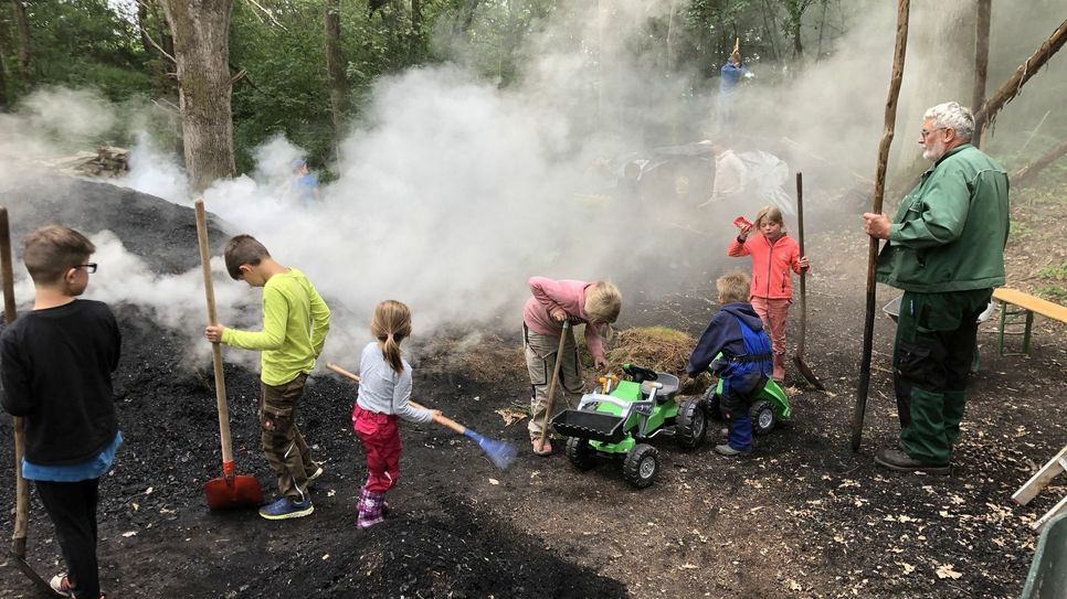 Mit buchstäblichen Feuereifer sind die Kinder dabei, wenn es gilt, sich um ihren Meiler zu kümmern - ganz gleich, ob nun mit schwarzer Erde und Grassoden abgedeckt oder mit der eigens angefertigten Köhlerlanze im Kinderformat für die nötigen Luftlöcher gesorgt wird.