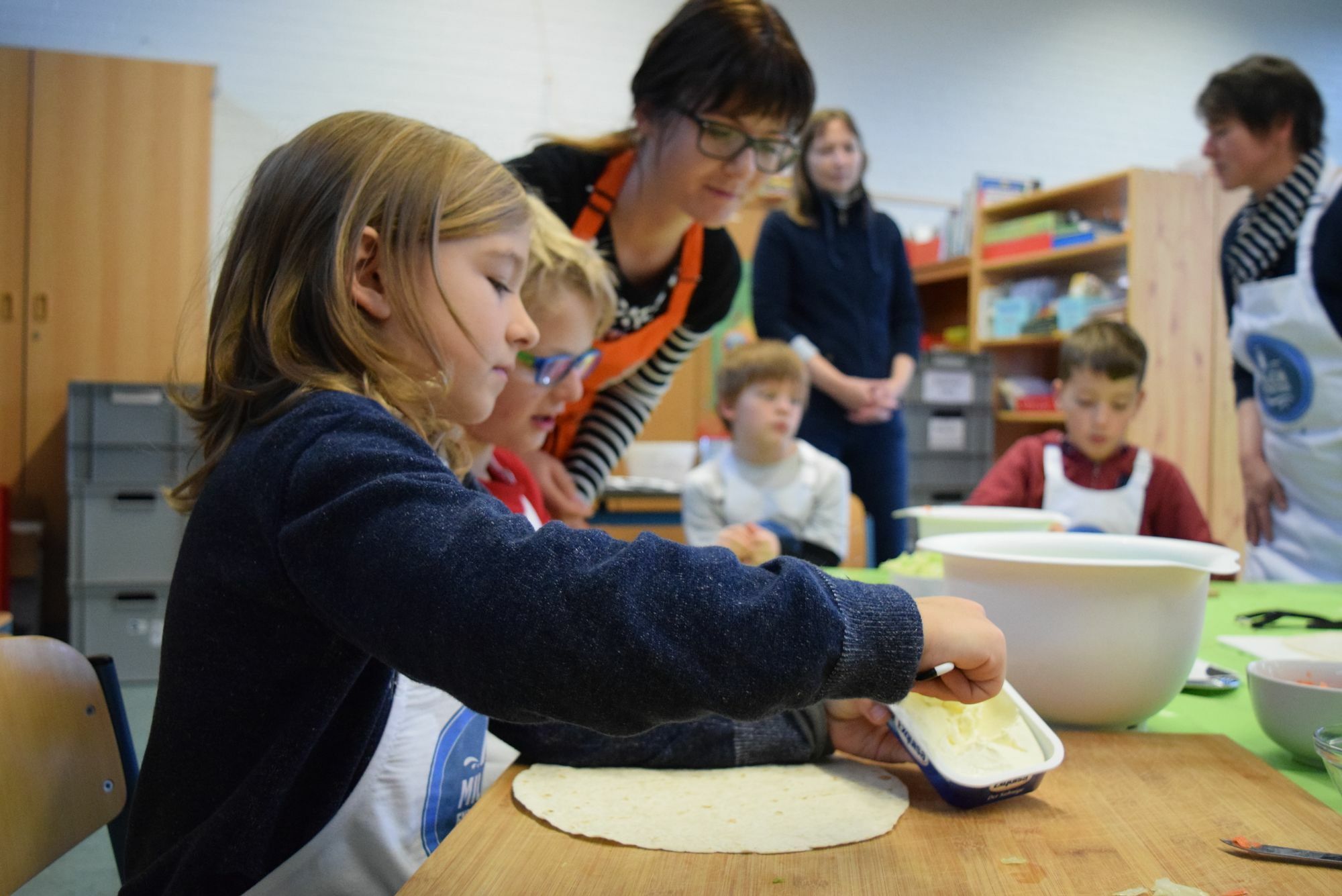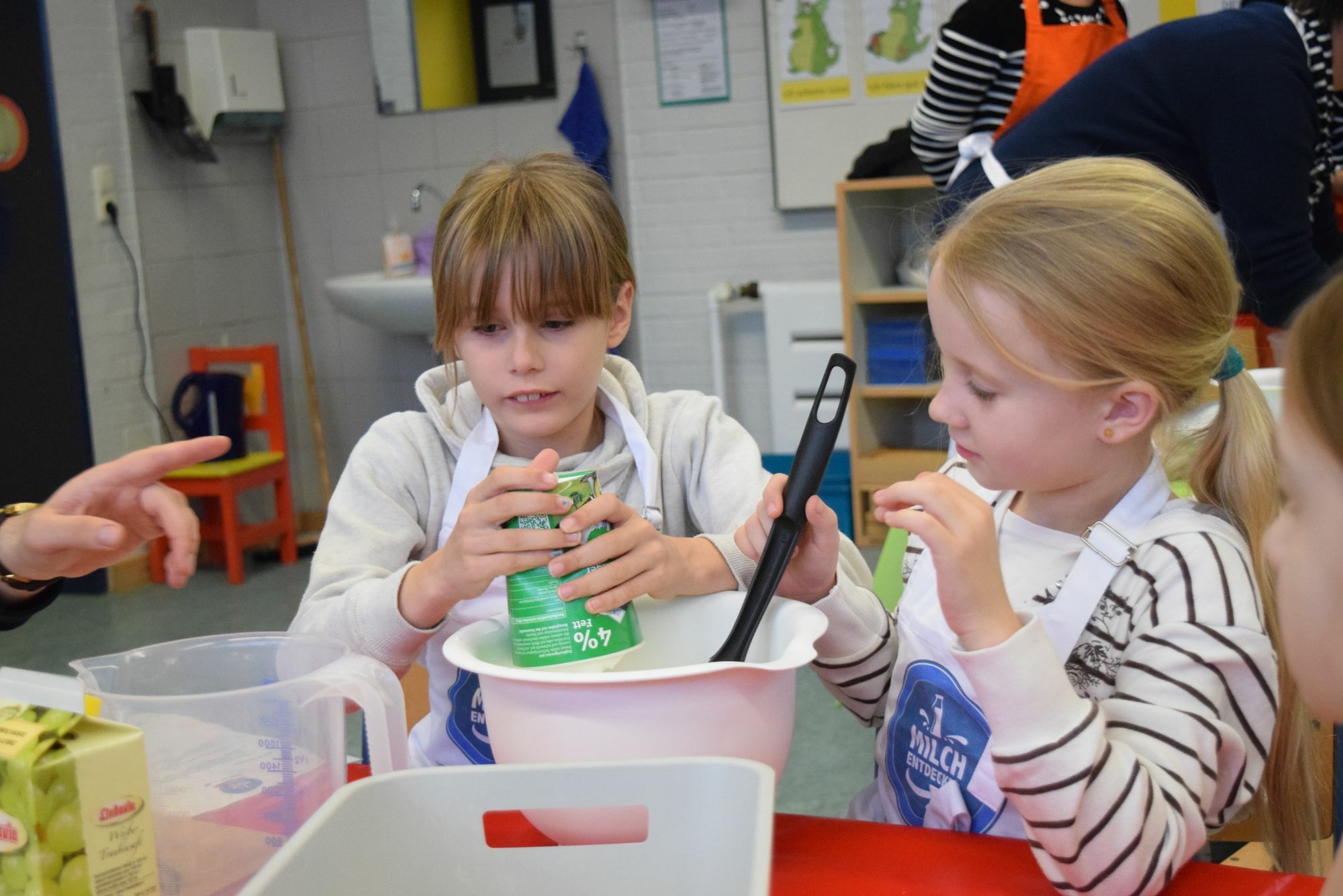 Kleinschneiden, Rühren, Würzen – 16 Grundschüler der Klasse 3a der Katholischen Grundschule Ülpenich durften als Teilnehmer der Milchentdecker-Tour ihre Fingerfertigkeit bei der Zubereitung von Gerichten mit Milch und Milchprodukten aus aller Welt unter Beweis stellen. Indischer Lassi, spanischer Milchreis sowie amerikanische Wraps standen dabei auf dem Speiseplan. Unter Anleitung von Landfrau Gisela Hilgers-Huppertz wurden alle Gerichte in einer eigens angefertigten mobilen Küche zusammen zubereitet und natürlich auch verkostet. »Die Schüler haben heute mit viel Freude gelernt, wie man frische Lebensmittel fachgerecht zubereitet. Das zeigt, dass eine ausgewogene und frische Ernährung mit der passenden Umsetzung richtig Spaß macht«, so Gisela Hilgers-Huppertz. Die achtjährige Patrisha war jedenfalls froh, dass die Fächer Religion und Englisch ausgefallen sind: »Kochen macht Spaß, ich helfe auch Zuhause mit. Ich habe schon Milchreis gekocht, Brötchen gebacken und auch Obst geschnitten«, erzählt sie. Klassenlehrerin Antonia Mommertz war überrascht, wie gut viele Kinder schon mit Messer und Reibe umgingen. Collin, 9 Jahre alt, raspelte fleißig Möhren und erzählte: »Ich habe mir dabei Zuhause schon mal die Finger verletzt, deshalb hätte ich jetzt lieber Mathe«. Dank der wachsamen Augen und Unterstützung von drei Müttern blieben an diesem Tag aber alle Kinder unverletzt. Ziel des Projekts ist es, die Ernährungskompetenz bei Kindern im Grundschulbereich am Beispiel des vielseitig einsetzbaren Lebensmittels Milch zu fördern und sie für eine Ernährung mit frischen Produkten zu begeistern. Denn: „Kinder, die sich gut ernähren, kommen fit und leistungsstark durch den Schulalltag, haben mehr Freude am Lernen und bessere Chancen auf Erfolgserlebnisse", erklärt Christina Schulze Föcking, Ministerin für Umwelt, Landwirtschaft, Natur- und Verbraucherschutz des Landes NRW, den Hintergrund der Initiative.