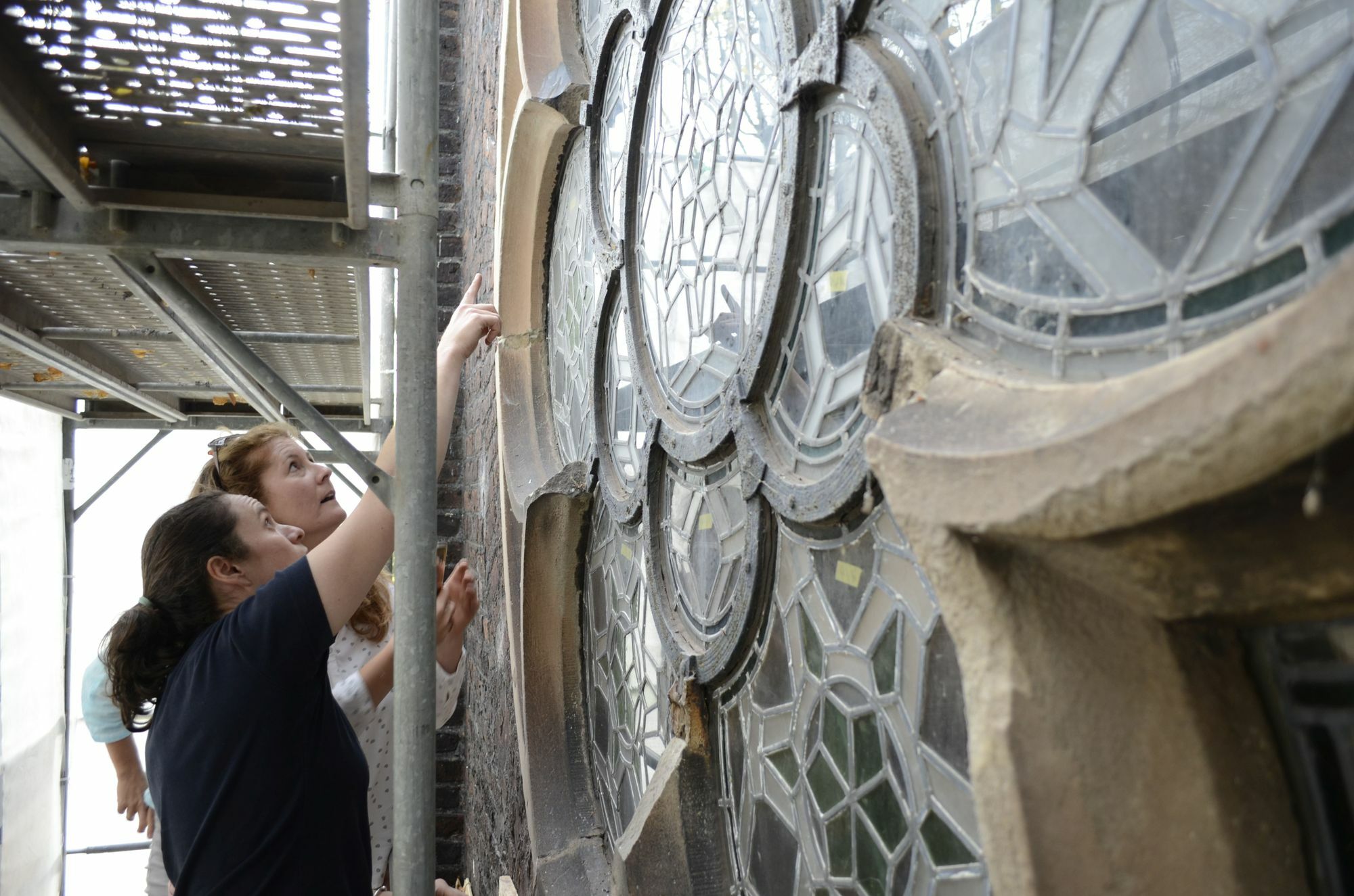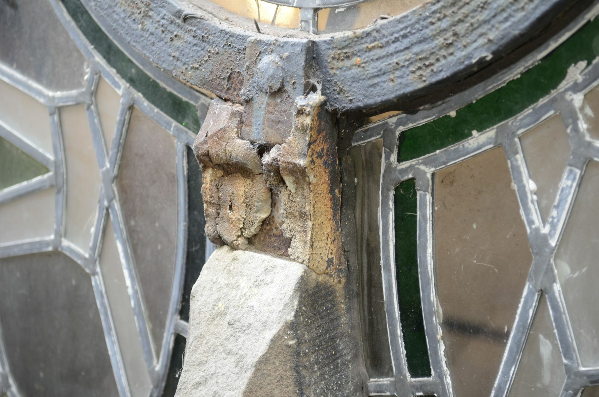 Zudem werden die Sandsteinspitzen komplett von einem Steinmetz erneuert und eine neue Nut für die Verankerung der Innenfenster hergestellt. »Auf den neuen Rahmen«, verrät Dunja Reinartz, »werden Dorne aufgeschweißt, die in diese Nut eingreifen. Zudem wird die Kunstverglasung mit Mörtel und nicht mit Kitt eingesetzt.