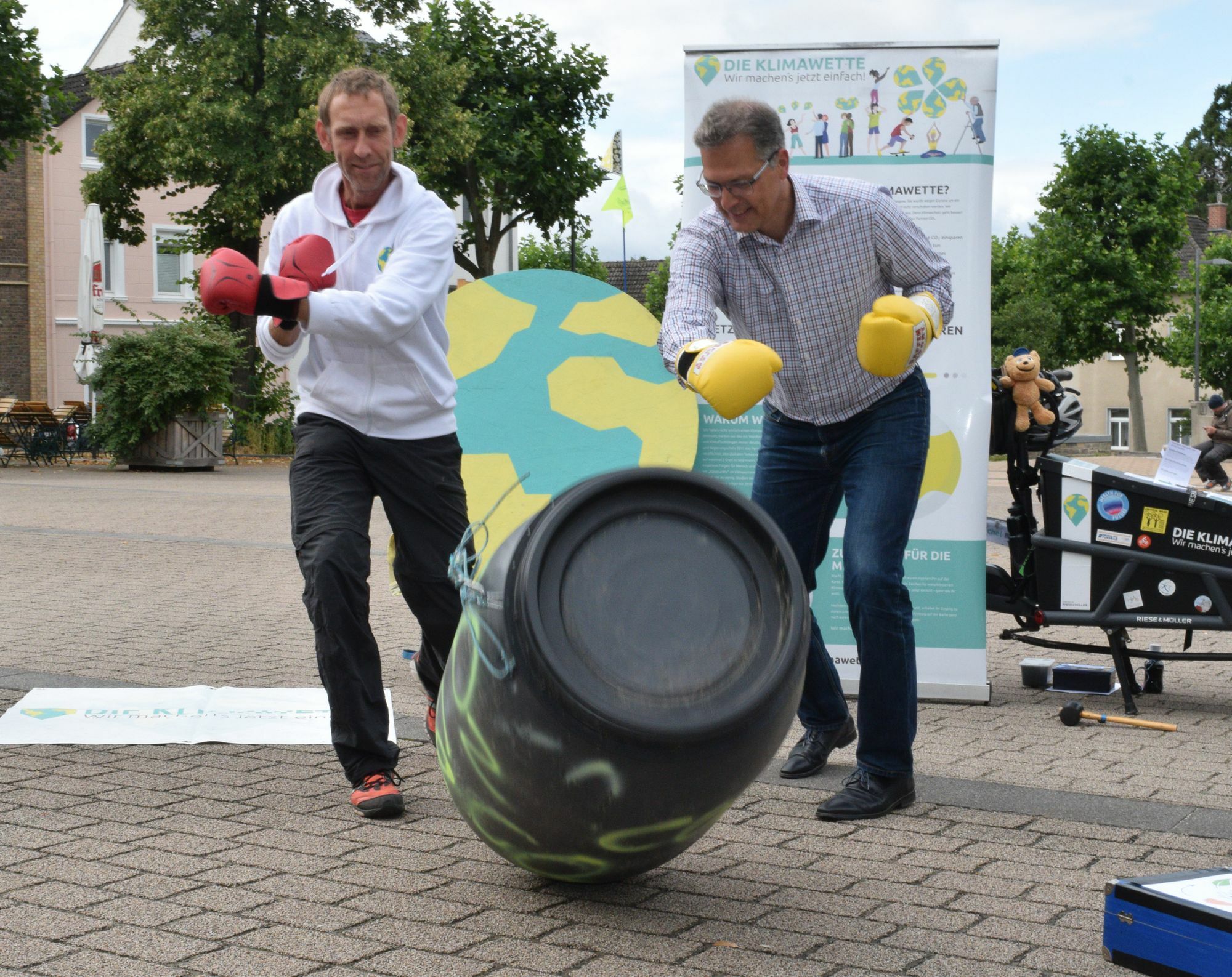 Das Motto der Sommerradtour »Kickt die Tonne!« ist durchaus wörtlich zu nehmen. In Zülpich nutzten Michael Bilharz (li. Initiator der Klimawette) und Bürgermeister Ulf Hürtgen (re.) allerdings Boxhandschuhe um die symbolische »Tonne CO2« im Rahmen der Klimawette umzuboxen. Foto: Scholl