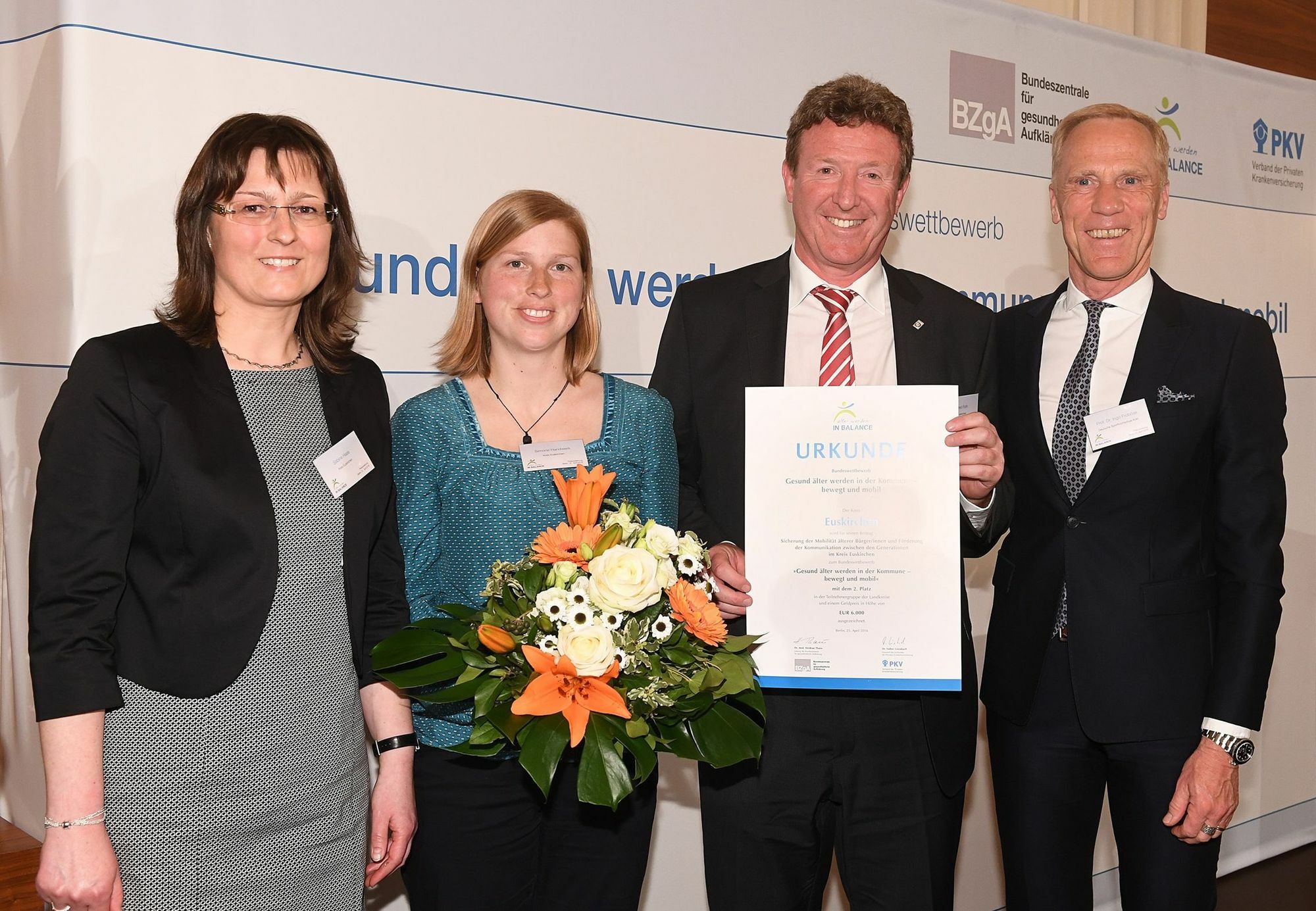 Insgesamt wurden neun Kommunen aus ganz Deutschland beim Festakt in Deutschen Parlamentarischen Gesellschaft in Berlin für ihre vorbildlichen Aktivitäten zur Bewegungs- und Mobilitätsförderung bei älteren Menschen ausgezeichnet. Der Wettbewerb wurde von der Bundeszentrale für gesundheitliche Aufklärung (BZgA) mit Unterstützung des Verbandes der Privaten Krankenversicherung (PKV) und der kommunalen Spitzenverbände durchgeführt. Für den Kreis Euskirchen haben Manfred Poth als Allgemeiner Vertreter des Landrats sowie Simone Handwerk (Team ÖPNV) und Sabine Haas (Zentrales Informationsbüro Pflege / Pflegestützpunkt) den Preis in Empfang genommen. Im Kreis Euskirchen werden im Rahmen der "DemografieInitiative" und im Fachbereich Mobilität eine Vielzahl an Projekten zur Förderung älterer Bürger umgesetzt. Beispielhaft wurden in diesem Wettbewerb jetzt drei einzelne Projekte dargestellt: „thürneMobil“, Pedelec-Schulungen und „Aktionswoche der Generationen“. Für dieses „Gesamtpaket“ wurde der Kreis in Berlin ausgezeichnet. In den sieben Dörfern am „Thürne" im Bad Münstereifeler Höhengebiet rund um Houverath wurde auf Bürgerinitiative hin das Projekt "thürneMobil" – (Dorfauto mit ehrenamtlichen Fahrern) entwickelt und umgesetzt. Nach der erfolgreichen Testphase im Rahmen des LEADER-Projektes E-ifel mobil unterstützte der Kreis Euskirchen den Bürgerverein "Dörfergemeinschaft am Thürne e.V." bei seinen Bemühungen zur dauerhaften Fortführung des Mobilitätsangebots. Der ehrenamtlich organisierte Fahrdienst ist gerade für ältere Menschen in den Dörfern wichtig. Mit der Hilfe ihrer Mitbürger können sie nun ihre Besuche beim Arzt und Einkäufe besser bewältigen. Auch für den Zusammenhalt und die Kommunikation in den Dörfern sowie der Austausch zwischen den Generationen hat das thürneMobil viel geleistet. Das Projekt hat Vorbildcharakter, heißt es aus dem Kreishaus. Sechs Pedelec-Schulungen für Senioren haben der KreisSportBund und der Kreis Euskirchen gemeinsam mit Partnern organisiert. Ziel dieser Schulungen war es, die Senioren an die Pedelecs heranzuführen, mit einer Sicherheitseinweisung vertraut zu machen und mit einer geführten Tour durch den landschaftlich reizvollen Kreis Euskirchen auf verkehrsarmen Straßen und Wegen für das Radfahren zu begeistern. Insgesamt nahmen 81 Teilnehmer an den Schulungen und Touren teil, davon waren 59 über 60 Jahre alt. Der älteste Teilnehmer war 78 Jahre, der Jüngste 16 Jahre alt. Seit 2011 findet unter Koordination des Zentralen Informationsbüros Pflege (Z.I.P.) und Pflegestützpunktes der Abteilung Soziales des Kreises Euskirchen regelmäßig im Herbst die Aktionswoche der Generationen statt. Innerhalb der Aktionswoche bieten zahlreiche Kindergärten, Schulen, Vereine, Wohlfahrtsverbände und Kirchengemeinden an verschiedenen Veranstaltungsorten im Kreisgebiet generationenübergreifende Angebote an. Die Aktionen reichen von gemeinsamen Gedächtnis-, Tisch- und Bewegungsspielen über Schulunterricht mit Zeitzeugen und Vorträgen bis zum sportlichen Generationentag. Alle Aktionen werden in einem Veranstaltungskalender veröffentlicht. Die gemeinsamen Aktionen tragen erfolgreich dazu bei, dass Kinder, Jugendliche und Senioren miteinander ins Gespräch kommen, neue Kontakte knüpfen und Erfahrungen austauschen. Viele nachhaltige Kontakte und Kooperationen sind bisher durch die Generationenwochen entstanden, beugen der Vereinsamung älterer Menschen vor und fördern das ehrenamtliche Engagement. Insgesamt führt die Aktionswoche der Generationen zu einer Verbesserung und Förderung des Generationendialogs im Kreis Euskirchen. Entstanden ist die Aktionswoche der Generationen als Projekt der Demografie-Handlungsfeldgruppe „Verständnis zwischen den Generationen“ des Kreises Euskirchen.