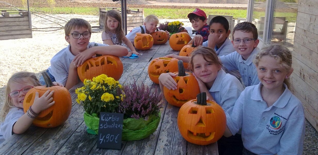 Jetzt kann das Schnitzen losgehen! Über 20 Sorten des farbenfrohen Gemüses, von mini bis über fußballgroß sind im Krewelshof erhältlich. Unter fachkundiger Anleitung entstehen aus den orangeleuchtenden Hokkaido-Schnitzkürbissen die gruseligsten Fratzen für Halloween oder dekorative Schalen und Vasen mit lieblichen Mustern. „Am Kürbis kann man seiner Kreativität freien Lauf lassen“, erklärt Theo Bieger schmunzelnd. „Wir helfen mit Ideen und Tipps!“ Kürzlich besuchte bereits eine achtköpfige Kindergruppe des Deutschen Roten Kreuzes auf Einladung des Krewelshofs die Schnitzwerkstatt. In einer Stunde hatte jedes Kind einen tollen Kürbis geschnitzt. Kürbisschnitzen für Gruppen ist bei vorheriger Anmeldung auch an Wunschterminen möglich. Vielleicht eine gute Idee für den Kindergeburtstag? Die Kosten des Schnitzens richten sich nach der Größe des Kürbisses. Ist der Kürbis kleiner als ein Fußball, dann sind 3,90 EUR zu entrichten, über Fußballgröße kostet es 4,90 EUR. Das kindgerechte und passende Schnitzwerkzeug sowie Anleitungen werden gestellt. Das Schnitzangebot am Wochenende gilt bis Halloween. Anmeldungen bitte unter Tel.-Nr. 022569577676.