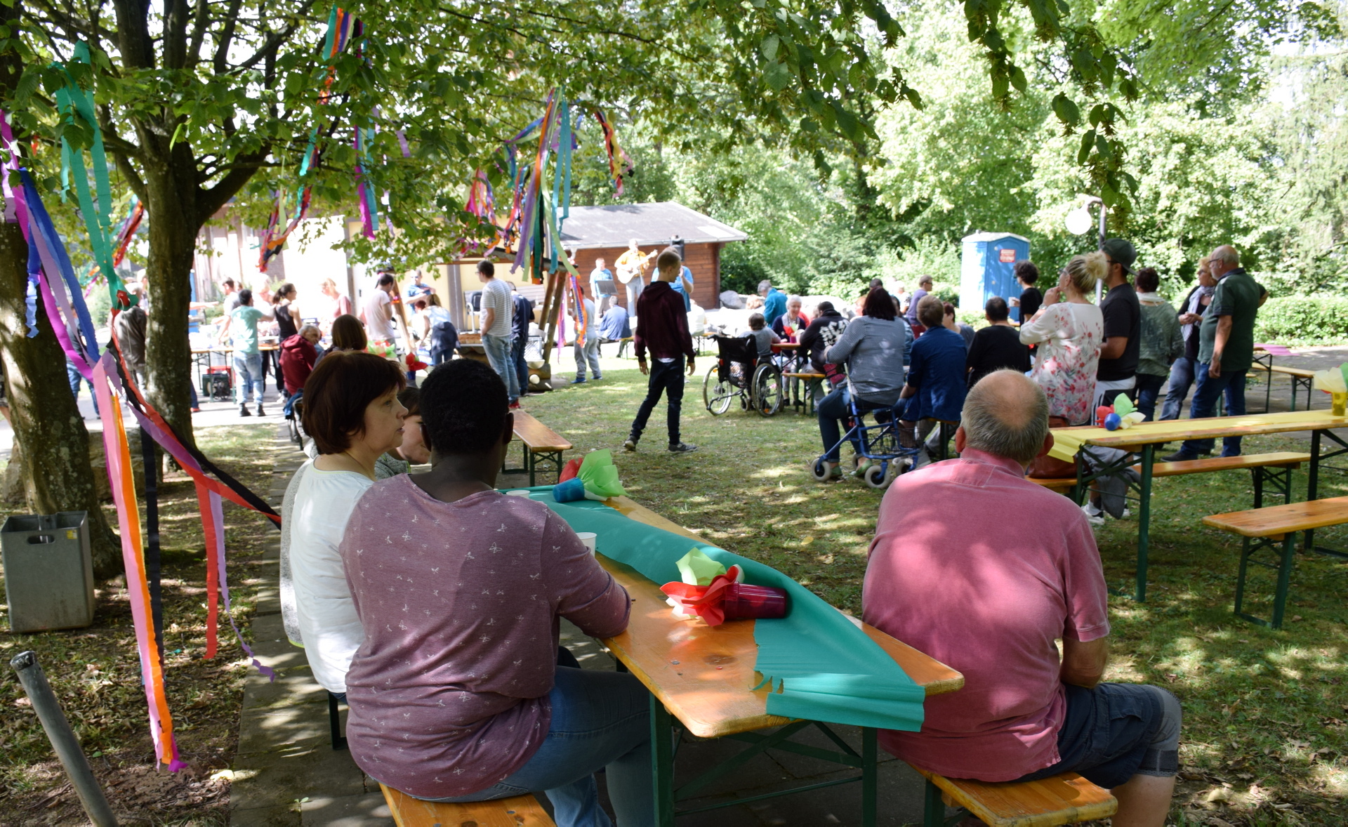 Fröhlicher Ferienabschluss mit Konzert und Pilzpfanne unter bunt geschmückten Buchen. Die Stiftung Lebenshilfe Bürvenich unterstützt Freizeitprogramm für Bewohner. Spenden sind willkommen.