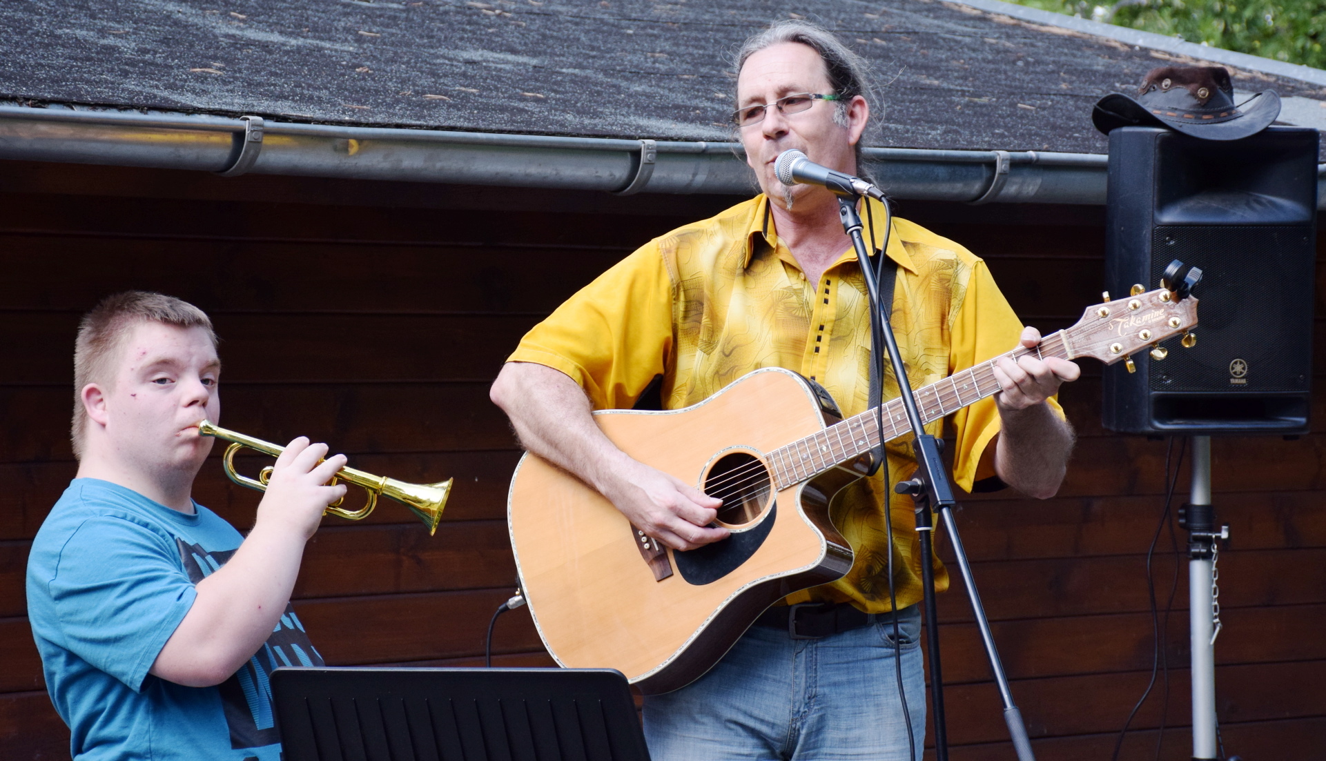 Maximilian hat besonders großen Spaß. Der Bewohner der Lebenshilfe HPZ pustet kraftvoll und taktkonform in die Trompete. Mit seinen Tönen begleitet er den Gitarristen Gilbert Behl beim Konzert zum Ferienabschlussfest.