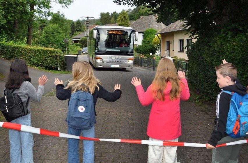 Kinder hatten die Straße mit einem rot-weißen Trassenband abgesperrt. Und ehe die Fahrt weiter nach Kall ging, bat Elternsprecher Christian Schütten Boro zum finalen Gruppenfoto mit den Kindern. Die übergaben dem treuen Chauffeur ein großes Bild mit allen Golbacher Grundschulkindern. »Das haben wir mit Boro am Kirmesmontag aufgenommen, als alle Kinder komplett waren«, so Schütten. Der übergab Boro zudem ein von allen Kindern unterschriebenes Dankschreiben der Eltern und eine Plakette mit der Inschrift: »Der immer früh aufsteht; der immer in den Spiegel schaut; der sicher fährt, und der Kinder mag – Bester Schulbusfahrer«.