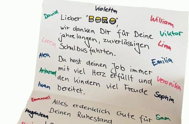 Wie beliebt Busfahrer Boro war, zeigten die vielen Dankesschreiben von Kindern und Eltern, die auf dem Armaturenbrett lagen. So bedankte sich ein Kind dafür »dass sie uns manchmal Süßigkeiten gegeben haben«. Und so war es nicht verwunderlich, dass den Kindern der Abschied von nicht leichtfiel. »Kinder aus Steinfeld haben geweint, als ich mich von ihnen verabschiedet habe«, so der beliebte Busfahrer.