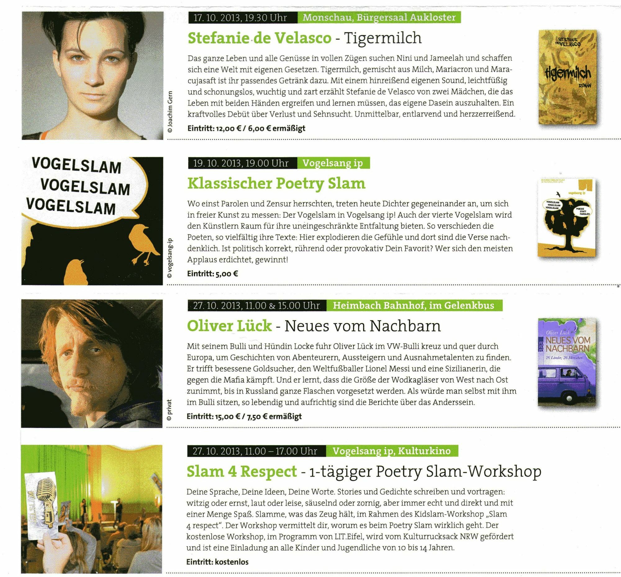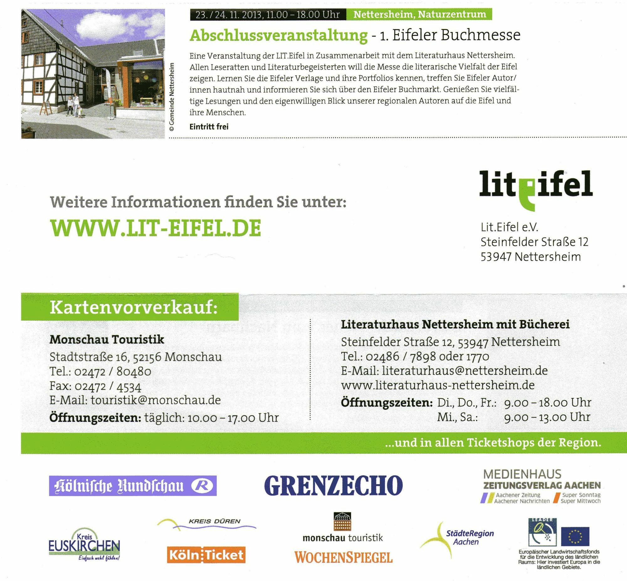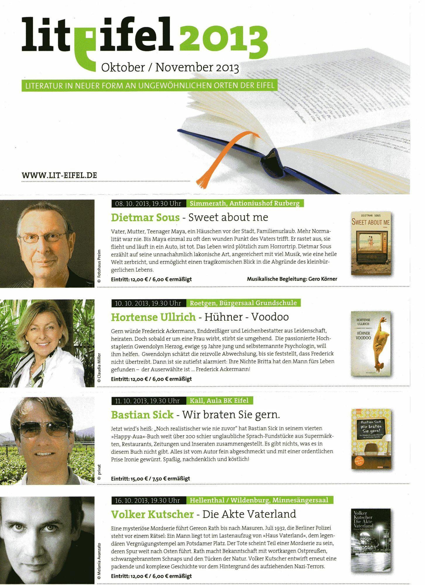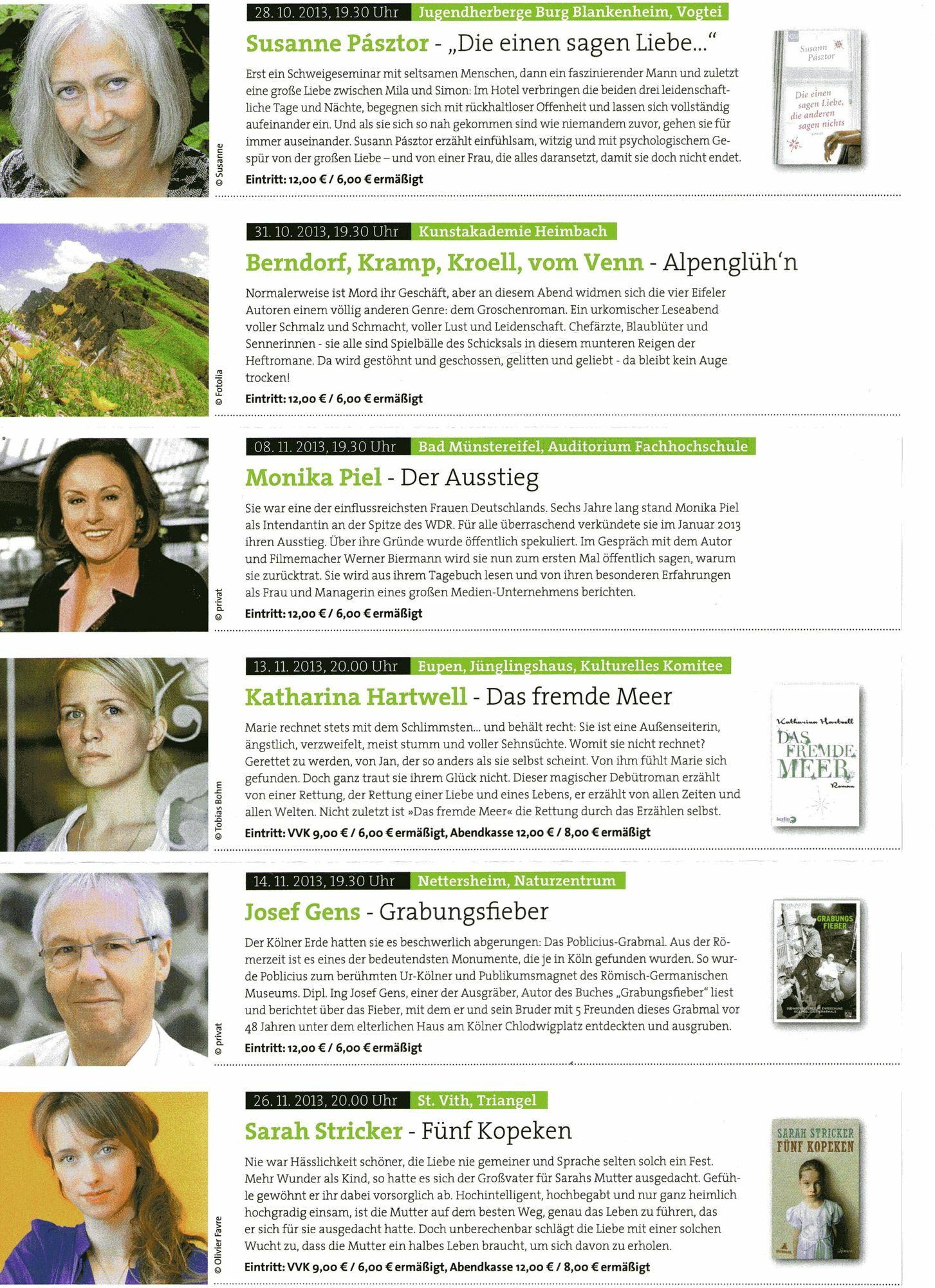 "Unser Bestreben", sagt Margareta Ritter, Vorsitzende von Lit.Eifel, "ist es, bei der Präsentation und der Vermittlung von Literatur neue Wege zu gehen." Es gehe in erster Linie eben nicht darum, prominente Autoren in großen Dreifachturnhallen zu präsentieren, sondern Literatur in der Region, aus der Region und für die Region zu bieten. "Lit.Eifel hat das Potenzial, unsere Region noch weiter nach vorne zu bringen", sagte auch Isabelle Weykmans, Ministerin für Kultur, Medien und Tourismus in der Deutschsprachigen Gemeinschaft Belgien, die eigens zur Programmvorstellung in die Internationale Kunstakademie nach Heimbach gekommen war. Sie freue sich auf die Lesung von Sarah Stricker am 26. November um 20 Uhr in der "Triangel" in St. Vith. Plattform bieten "Wir wollen", so Ritter, "allen, die an Literatur interessiert sind, eine Plattform bieten und sie zum Mitmachen anmieren." Ein Ansinnen, das offenbar bereits sehr gut angenommen wird, wie Kerstin Juchems vom Literaturhaus Nettersheim zu berichten wusste. Gleich nach dem Bekanntwerden der Gründung von Lit.Eifel hätten sich zahlreiche Menschen gemeldet. Nicht zuletzt sie gaben den Anstoß dazu, am 23./24. November in Nettersheim die erste Eifeler Buchmesse zu veranstalten. "Dort können sich", so Juchems, "die Autoren der Region, seien es nun gestandene Schriftsteller oder Menschen, die bislang nur im stillen Kämmerlein geschrieben haben, sowie die Eifeler Verlage präsentieren." Rund 120 Autoren und 25 Verlage würden in den nächsten Tage angeschrieben. Literatur in Schulen und Dörfer bringen Die Verantwortlichen wollten dabei das vorgestellte Programm in erster Linie als stabile Konstante statt starrem Korsett verstanden wissen. "Wir wollen", so Helmut Lanio, "Literatur auch in die Schulen und Kindergärten zu bringen." So seien etwa Musik-Workshops mit bekannten Musikern in Grundschulen oder kleinen Jugendgruppen durchaus denkbar. Vor allen Dingen aber wolle man ganz bewusst in die kleinen Orte und Dörfer gehen und dort interessante, innovative Veranstaltungen entwickeln. Starkes Engagement Mit welchem Enthusiasmus man bei Lit.Eifel unterwegs ist, verdeutlicht eine Veranstaltung, die am 8. November um 19.30 Uhr im Auditorium der Fachhochschule Bad Münstereifel stattfindet. "Der Ausstieg" lautet das Motto des Abends. Zu Gast ist Monika Piel, die dort im Gespräch mit dem bekannten Filmemacher Werner Biermann über die Gründe ihres freiwilligen Abschieds von der Spitze des WDR reden wird. Biermann, der Lit.Eifel sehr stark unterstützt, hatte ihr dieses Podium vorgeschlagen. Vergnüglich dürfte auch der Abend werden, zu dem die bekannten Eifel-Autoren Berndorf, Kramp, Kroell und vom Venn am 31. Oktober in die Kunstakademie Heimbach einladen. Wer nun glaubt, es gehe um das Genre "Krimi", sieht sich getäuscht. Vielmehr wollen sich die Autoren unter dem Motto "Alpenglüh'n" mit dem Groschenroman beschäftigen. Gestartet wird der bunte Programmreigen am 8. Oktober, um 19.30 Uhr mit einer Lesung von Dietmar Sous, "Sweet about me", im Antoniushof von Rurberg. Das komplette Programm ist auf den nebenstehenden Bildern zu entnehmen oder im Internet nachzulesen unter www.lit-eifel.de Karten für die einzelnen Veranstaltungen gibt es in allen Ticketshops der Region und hier.