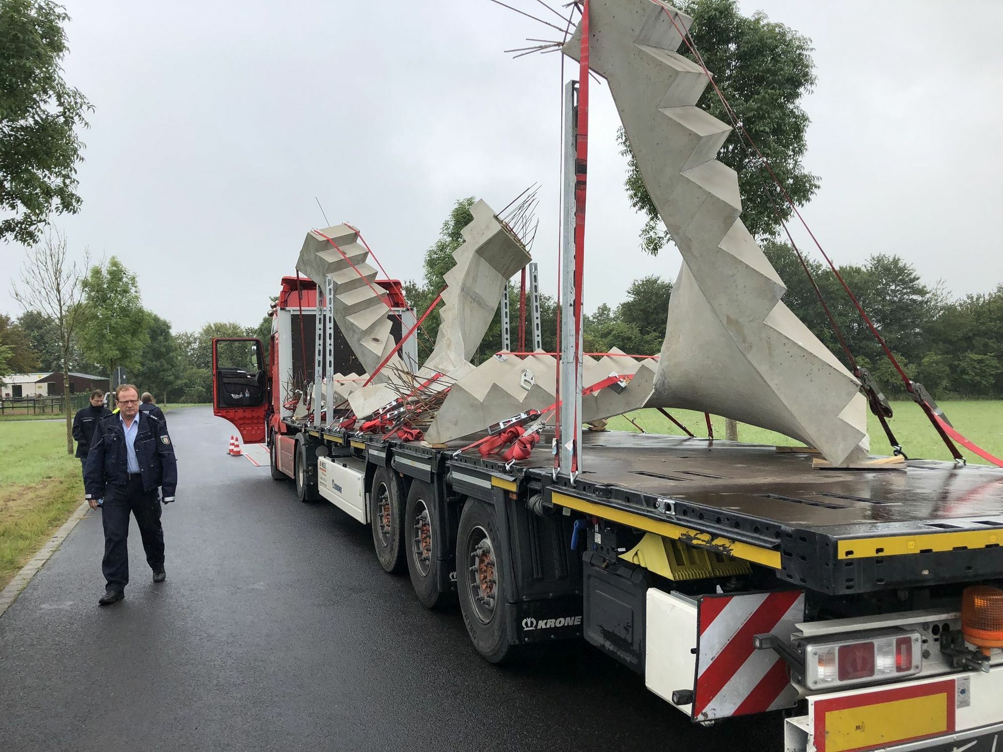 Schnell bildete sich in der Industriestraße eine lange Reihe von Lkw, die überprüft werden mussten. Allen voran der bereits erwähnte Truck mit dem bulgarischen Kennzeichen, der eine rund acht Tonnen schwere Betontreppe geladen hatte. „Die Überprüfung“, so Dieter Frantzen, „wird Zeit in Anspruch nehmen. Denn hier stimmt einiges nicht.“ Beispielhaft zeigte er einige Punkte auf. So lag die Gesamthöhe und –breite des Lkw mit Hänger und Fracht mit 4,49 Metern Höhe und 2,86 Metern Breite deutlich über den erlaubten Maßen von 4 Metern Höhe und 2,55 Metern Breite.