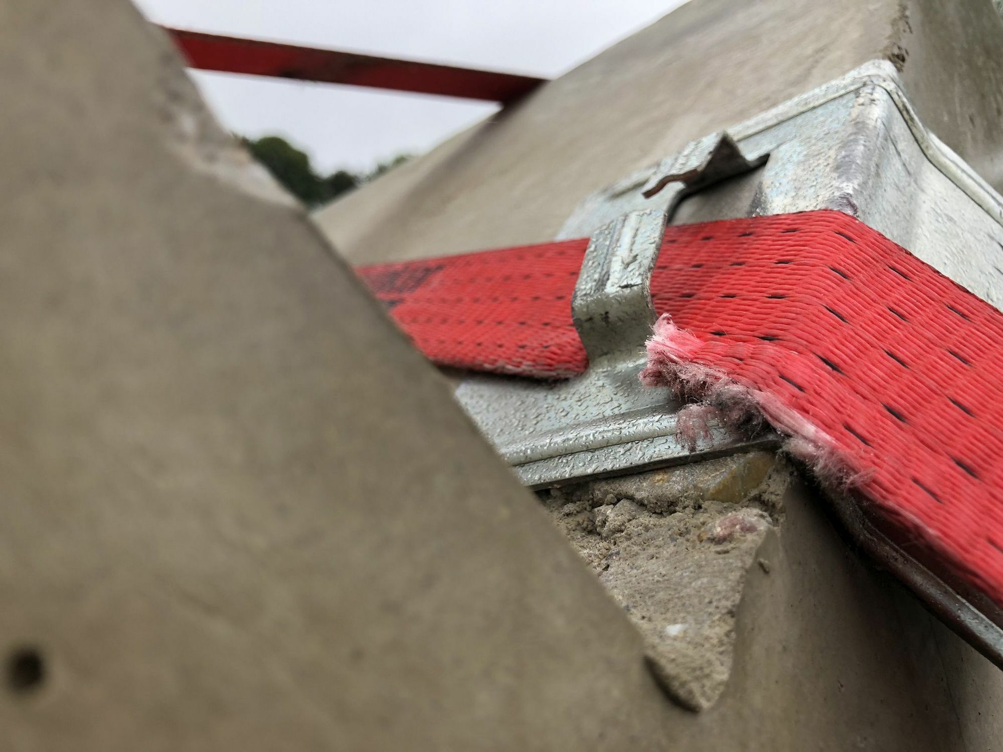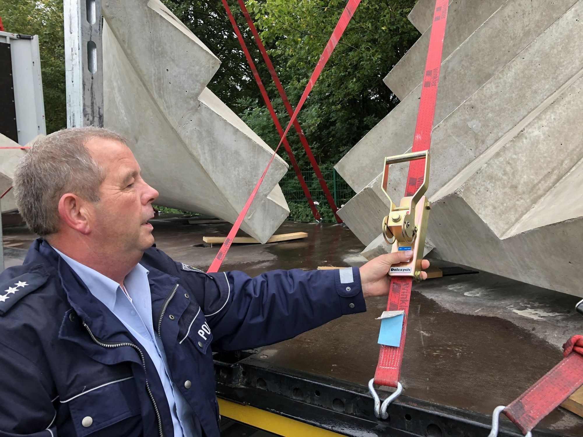 „Mit solchen Maßen darf man auf die Straße, wenn man sich dafür zuvor eine Genehmigung eingeholt hat, in der dann eine Streckenführung vorgeschrieben wird, damit der Lkw nicht an Brücken oder Unterführungen hängen bleibt“, so Frantzen. Im konkreten Fall liege eine solche Genehmigung nicht vor. Zudem sei die Sicherung der schweren Ladung nicht in Ordnung. Zwar waren die vorgeschriebenen Spanngurte angebracht, denen es jedoch komplett an der benötigten Spannkraft fehlte, wie Dieter Frantzen mit einem Spezialgerät prüfen konnte. Auch der Kantenschutz fehlte entweder oder war fehlerhaft vorhanden. „Das hat beispielswiese an einer Stelle dazu geführt, dass der Spanngurt deutlich eingerissen ist“, zeigte der erfahrene Polizist auf die schadhafte Sicherung. Dieser Gurt könne jederzeit reißen, die Ladung gefährlich verrutschen.