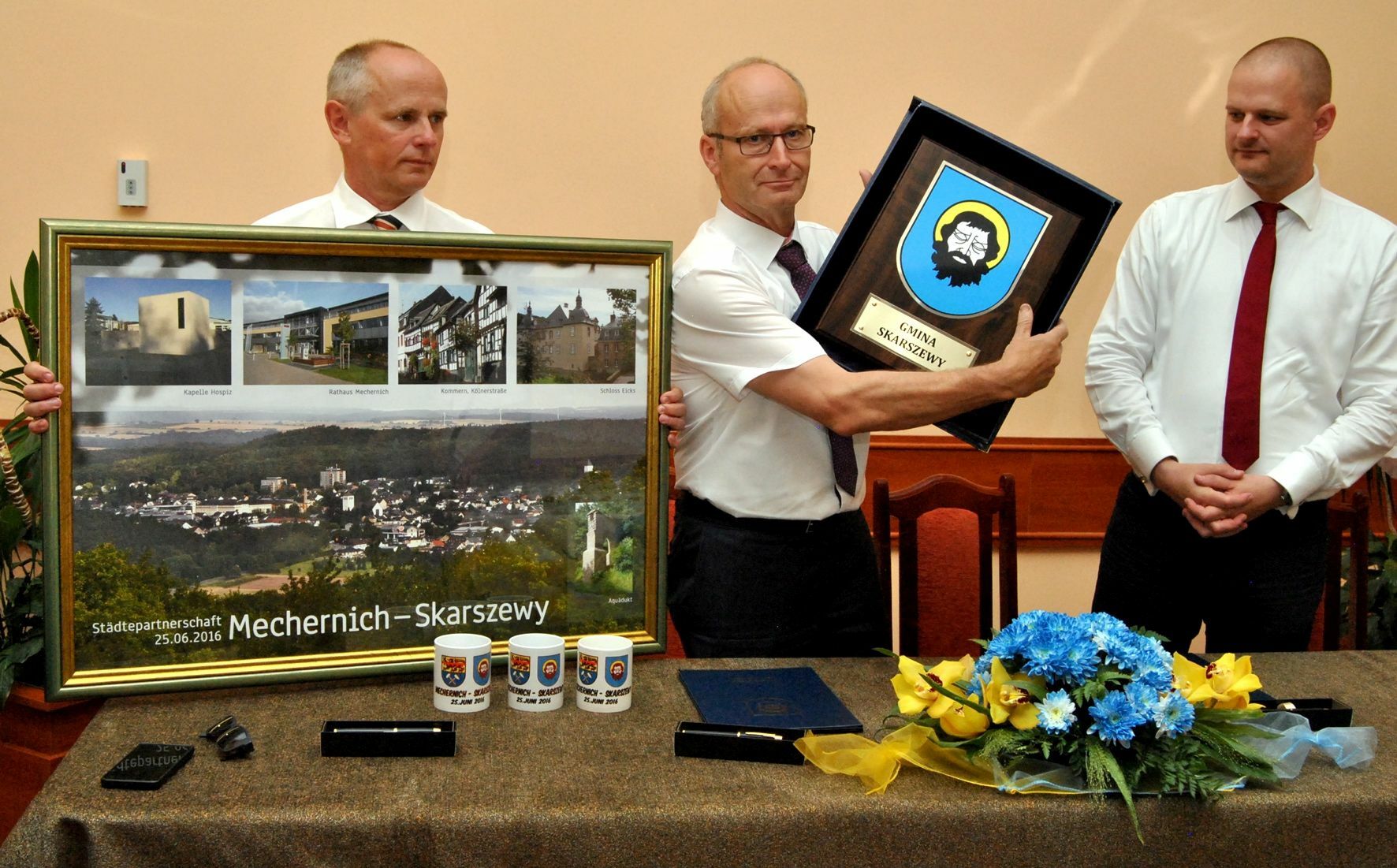 Mit großer Herzlichkeit haben Mechernich und die polnische Stadt Skarszewy ihre seit sieben Jahren bestehenden freundschaftlichen Beziehungen jetzt auch offiziell besiegelt. Im Rathaus von Skarszewy unterschrieben Bürgermeister Dr. Hans-Peter Schick, sein polnischer Kollege Jacek Pauli sowie Kämmerer Ralf Claßen und Jozef Kaminski, der Ratsvorsitzende von Skarszewy, die Urkunden der Städtepartnerschaft.