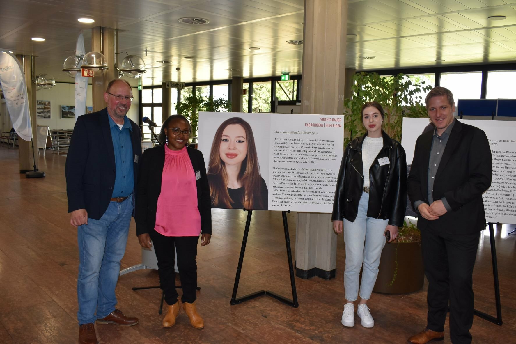 Kürzlich eröffnete Landrat Markus Ramers im Kreishaus Euskirchen eine Ausstellung zum Thema Integration. Gezeigt werden Portraits junger, zugewanderter Menschen, die ihre persönliche Geschichte erzählen. Integration ist ein Weg, der nicht von heute auf morgen gelingt. Es kommt auf den individuellen Einsatz der jungen Erwachsenen und auf die Bereitschaft in der Bevölkerung an. Diese ist in Euskirchen hoch, 130 verschiedene Nationen leben dort, so der Integrationsbeauftragte Erdmann Bierdel. Der Kreis lebt Vielfalt und unterstreicht seine Bekenntnis zu einer weltoffenen Gesellschaft und Politik. So entstand auch die Zusammenarbeit mit Norbert Weber, Leiter des Jugendmigrationsdienst (JMD) in Euskirchen. Gemeinsam mit seinen Mitarbeitenden und zahlreichen, engagierten Ehrenamtlichen begleitet der JMD, in Trägerschaft der Katholischen Jugendagentur (KJA) Bonn, mit viel Einfühlungsvermögen zugewanderte junge Menschen auf ihrem Weg in Deutschland. Sie erfahren sozialpädagogische Unterstützung, wie Integrationskurse, Kontakt mit anderen Jugendlichen, Rat bei der Berufsorientierung, Beistand bei familiären Schwierigkeiten oder praktische Hilfe zur Überwindung bürokratischer Hürden.