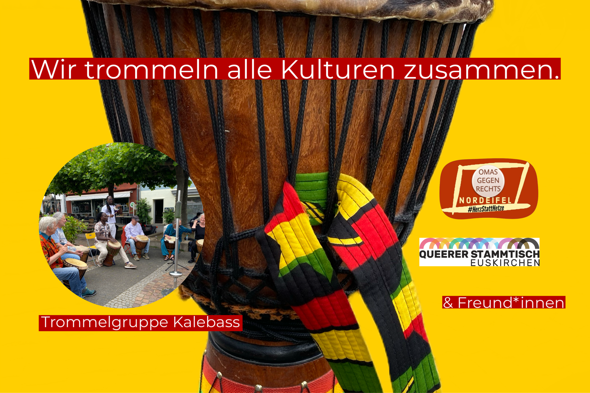 Jeden Montagabend von 18 bis 19 Uhr verwandelt sich der Alte Markt in Euskirchen in einen lebendigen Treffpunkt für Demokratie, Menschlichkeit, Vielfalt und Toleranz. Unter dem Motto "Mer stonn zesamme" versammeln sich dort die "Omas gegen Rechts Nordeifel", der "Queere Stammtisch Euskirchen", Freundinnen und Freunde sowie zahlreiche Interessierte, die neugierig stehen bleiben, das Gespräch suchen und sich Informationsmaterial anschauen. Diese wöchentliche Zusammenkunft ist mehr als nur ein Treffen; sie ist ein starkes Zeichen des Zusammenhalts und der Solidarität. Immer mehr Menschen schließen sich dieser Bewegung an und setzen ein sichtbares Zeichen für die Werte, die unsere Gesellschaft zusammenhalten. Jeder Montag ist dabei etwas Besonderes, denn es gibt immer spezielle Aktionen, die die Teilnehmer*innen zusammenbringen und inspirieren. So wurde am 8. Juli 2024 die Trommelgruppe Kalebass eingeladen, um mit ihrer beeindruckenden und mitreißenden Musik das verbindende Anliegen zu unterstützen. Die Klänge der Trommeln erfüllten den Alten Markt und zogen die Aufmerksamkeit auf sich. Trommeln haben eine tief verwurzelte Bedeutung; sie sind uralte Instrumente, die Botschaften in die Welt hinaustragen. An diesem Abend lautete die Botschaft: "Wir sind mehr, immer mehr, die jetzt erst recht für unsere Demokratie einstehen." Die Energie, die von der Trommelgruppe Kalebass ausging, war förmlich spürbar und ließ viele sich im Takt der Trommeln bewegen. Es ist genau diese Art von Aktionen, die "Mer stonn zesamme" zu etwas Besonderem machen. Die Vorfreude auf die kommenden Montage ist groß. Welche besonderen Aktionen und Begegnungen werden uns erwarten? Welche inspirierenden Momente werden wir erleben? Eines ist sicher: Der Alte Markt in Euskirchen wird auch in Zukunft ein Ort bleiben, an dem Menschen zusammenkommen, um für eine bessere, menschlichere und tolerantere Welt einzustehen.