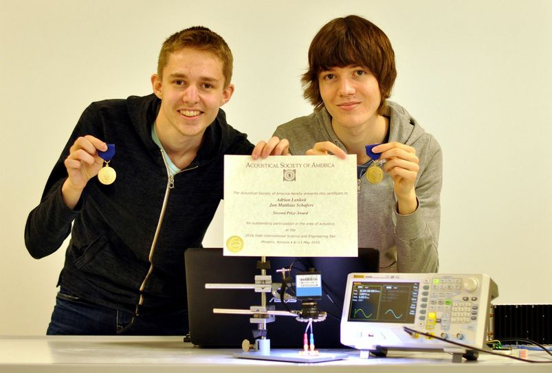 Mit zum deutschen Team gehörte auch Matthias Schäfers (17 Jahre) vom St. Michael-Gymnasium aus Bad Münstereifel. Zusammen mit Adrian Lenkeit (16 Jahre) entwickelte Matthias ausgefeilte, auf akustischen Oberflächenwellen basierende Steuereinheiten für Labore im Miniformat, sogenannten Labs-on-a-Chip. Damit ist es den beiden Schülern möglich, kleinste Tropfen berührungslos gezielt zu bewegen, zusammenzuführen und miteinander zu mischen. So können sie mit geringsten Mengen chemische Reaktionen erzeugen. Ein solches Labor im Miniaturformat ermöglicht nicht nur eine große Platzersparnis, sondern auch eine immense Kostenersparnis bezüglich der eingesetzten Materialien sowie der entstehenden Kosten für die Entsorgung. Betreut wurden die beiden jungen Forscher, die mit ihrer Arbeit auch schon auf dem Bundeswettbewerb Jugend forscht im Jahre 2015 erfolgreich waren, von Physiklehrer Walter Stein. Weitere Unterstützung erhielten sie von Prof. Dr. Achim Wixforth und seinem Team vom Institut für Physik der Universität Augsburg. Da Adrian Lenkeit kurz vor dem Abflug in die USA erkrankte, musste Matthias das gemeinsam erarbeitete Projekt „Acoustic Microfluidics with tiny Droplets“ in Phoenix alleine präsentieren und sich den bohrenden Fragen von 18 Juroren stellen. Jetzt wurden bei der Special Awards Ceremony die ersten Preise verliehen. Bei der starken und zahlenmäßig sehr großen Konkurrenz war die Freude von Matthias riesengroß, als er auf die Bühne gerufen wurde, um dort den mit 500 Dollar dotieren Preis der Acoustical Society of America entgegen zu nehmen. Zusätzlich erhielt er noch einen Scheck über 300 Dollar als finanzielle Unterstützung für weitere gute Forschungsprojekte am St. Michael-Gymnasium.