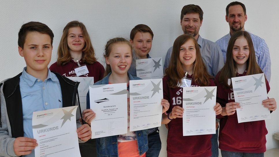 Anna Lieder, Leo Lenz und Elias Günthner aus der Klasse 6b konnten mit ihrer Arbeit „Fernsehen für zwei“, betreut von Physiklehrer Christian Plötzing, den zweiten Platz im Fachbereich Technik erringen. Zusätzlich wurde die Arbeit noch mit dem Sonderpreis „Rundfunk-, Fernseh- und Informationstechnik der Eduard-Rhein-Stiftung ausgezeichnet. Anstoß der Arbeit war häufiger Streit innerhalb der Familie um die Frage, welches Fernsehprogramm zusammen gesehen werden soll. Deswegen wollten die Schüler eine Lösung finden, mit der jeder das Programm schauen kann, was er möchte. Dazu modifizierten sie die Shutterbrillen eines 3D-fähigen Fernsehers so, dass zwei Personen auf demselben Fernseher gleichzeitig verschiedene Programme schauen können. Außerdem fanden die Schüler einen Weg, so dass die verschiedenen Zuschauer auch die entsprechenden Tonsignale auf einem Kopfhörer hören konnten. Das Team von Biologielehrer Nikolaus Weiler erhielt einen zweiten Preis im Fachbereich Biologie für ihr Projekt "Gärtner ohne Garten - Pflanzenbau 2.0 - Hydroponik". Die Schülerinnen Marlene Parschau, Marla Cyriax und Julia Peintinger aus der Klasse 7b konstruierten eine funktionsfähige Anlage, auf der unter anderem Salate in einem Kreislauf von einer Nährlösung umspült werden. Die so gezogenen Gemüse benötigen für ihr Wachstum keine Erde, was einen Schädlingsbefall drastisch reduziert. Zusätzlich ist die Anlage sehr Ressourcen schonend und auch noch optisch ansprechend. In Zukunft kann so Jedermann Zuhause seinen eigenen kleinen Garten im Wohnzimmer stehen haben, auf der immer frische, unbelastete Gemüse stehen. Dies ist auch und gerade in Großstädten eine attraktive Alternative.