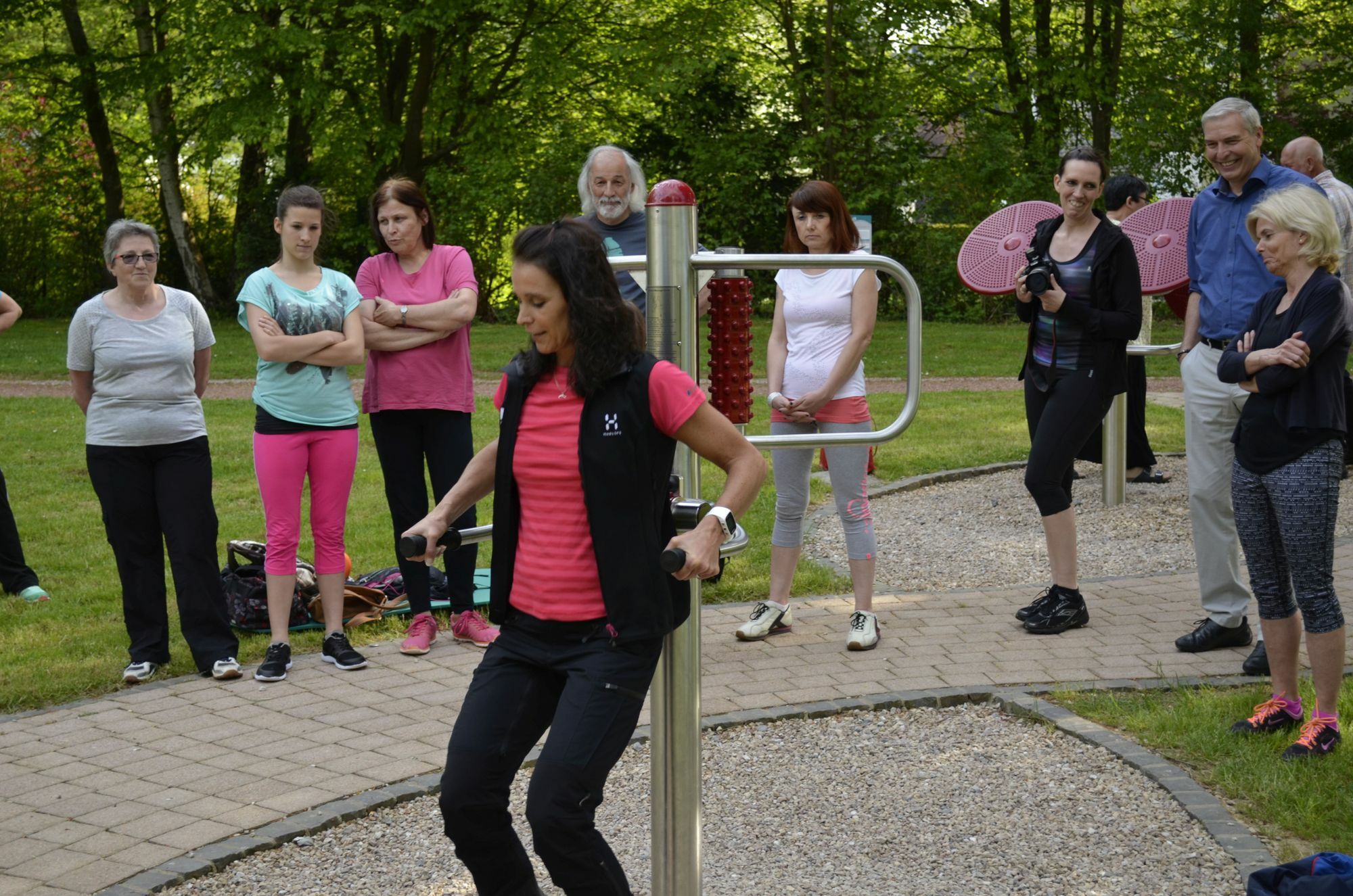 »Eine ganz tolle Einrichtung«, schwärmte Nicole Mertens, die seit 20 Jahren als Fitness- und Aerobictrainerin tätig ist. »Ich habe 1000 Ideen, was man hier so alles machen kann.« Zunächst aber freute sie sich über die große Resonanz bei der ersten kostenlosen Fitnessstunde. Rund 20 Teilnehmer aus allen Altersklassen waren erschienen und ließen sich zunächst von Nicole Mertens die Funktionsweise der einzelnen Geräte erklären. Unter den Gästen befand sich auch Schleidens Bürgermeister Udo Meister, der sich über die Akzeptanz des Fitnessgartens freute: »Der passt wunderbar in den Kurpark. Jetzt müssen wir ran, um auch den Rest des Geländes attraktiv zu gestalten.« Der Bewegungsgarten wurde im Kurpark Gemünd zwischen Nationalpark-Tor und Minigolfanlage mit sechs Outdoor-Fitnessgeräten errichtet. Die speziell für den öffentlichen Bereich konzipierten Geräte greifen die Aspekte Bewegung und Massage auf.