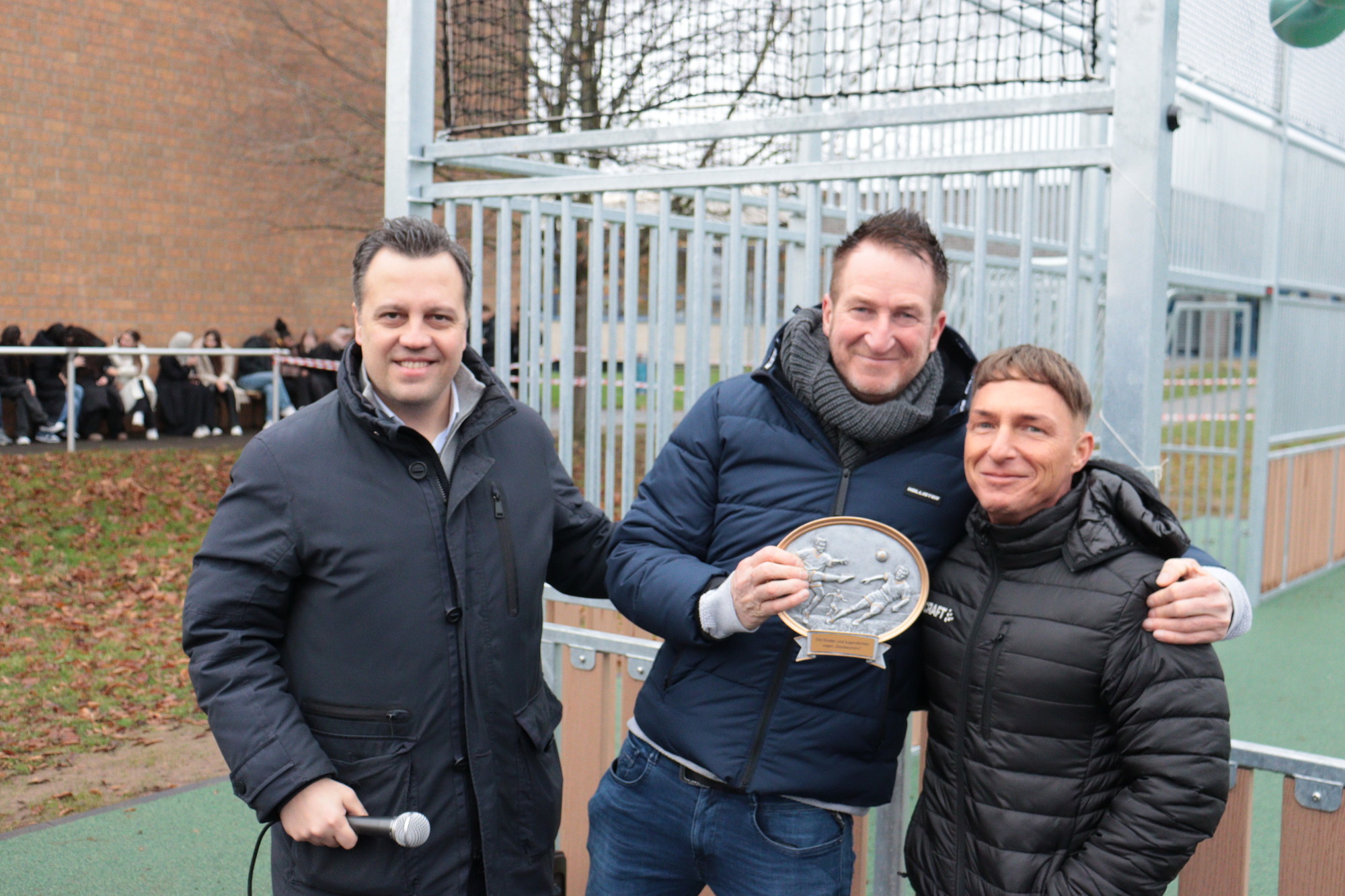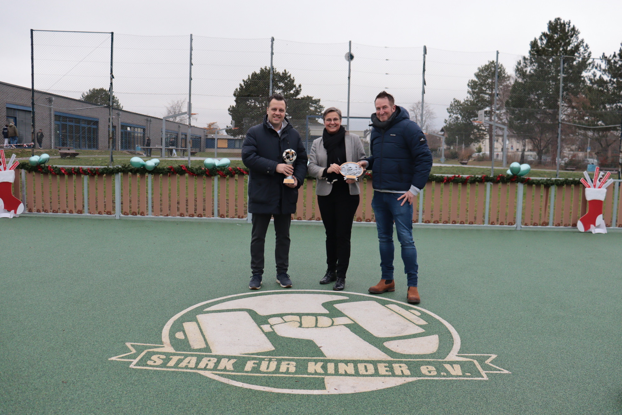 In wenigen Wochen hat der Verein »Stark für Kinder« ein tolles Projekt auf die Beine gestellt. Mit einer Spende von über 120.000 Euro und viel persönlichem Einsatz hat der Verein ermöglicht, eine Multisportanlage für Kinder und Jugendliche auf dem Gelände der Kaplan-Kellermann-Schule zu schaffen. So haben die Mitglieder des Vereins nicht nur die Finanzierung zur Verfügung gestellt, sondern auch selber mit angepackt und den Bau der Anlage unterstützt. Nach dem der Spatenstich im September stattgefunden hatte, konnte vor wenigen Tagen die Multisportanlage nun schon eröffnet werden. »Ich bedanke mich für das tolle Engagement des Vereins. Wir brauchen mehr Menschen, die sich so für ihre Heimatstadt einsetzen«, lobte Bürgermeister Sacha Reichelt die Arbeit des Vereins bei der offiziellen Eröffnung. Die Stadt Euskirchen hatte das Projekt mit 30.000 Euro unterstützt. Der Startschuss auf der Sportanlage wurde mit einem kleinen Fußballturnier gefeiert, bei dem der Verein, Lehrkräfte und Jugendliche aus der Schule sowie die Stadtverwaltung jeweils ein Team stellten.