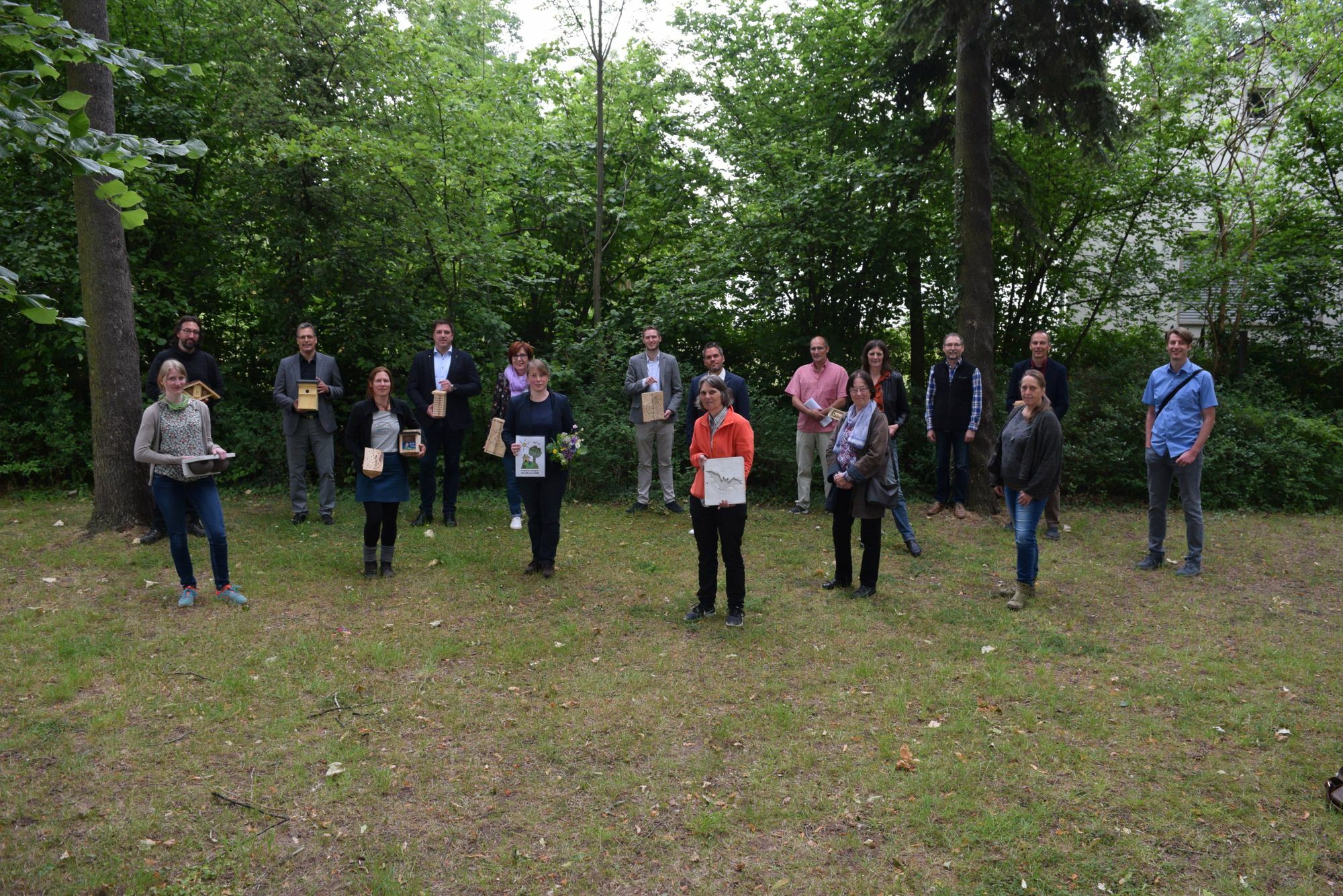 Die Geschäftsführer der Biologischen Stationen stellten im Rahmen einer Pressekonferenz das Projekt »Na-Tür-lich Dorf« und verschiedene Nisthilfen und Insektenhotels vor« (v.li.): Heidrun Düssel (Kreis Düren) Christian Chmela (Bonn/Rhein-Erft), Christopher Mertes (Städteregion Aachen) und Stefan Meisberger (Kreis Euskirchen). Foto: Scholl