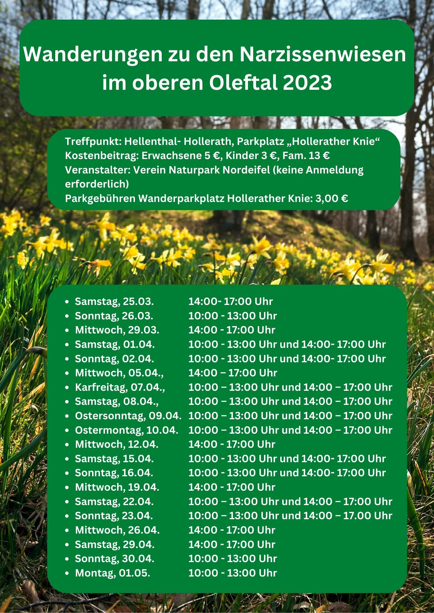 www.hellenthal.de/freizeit-tourismus/sehenswertes/narzissenwiese In diesem Jahr werden wieder geführte Wanderungen entlang der Narzissenwiesen im oberen Oleftal angeboten. Dabei ist festes Schuhwerk dringend erforderlich. Treffpunkt ist am Parkplatz »Hollerather Knie« in Hollerath. Eine vorherige Anmeldung ist nicht erforderlich.