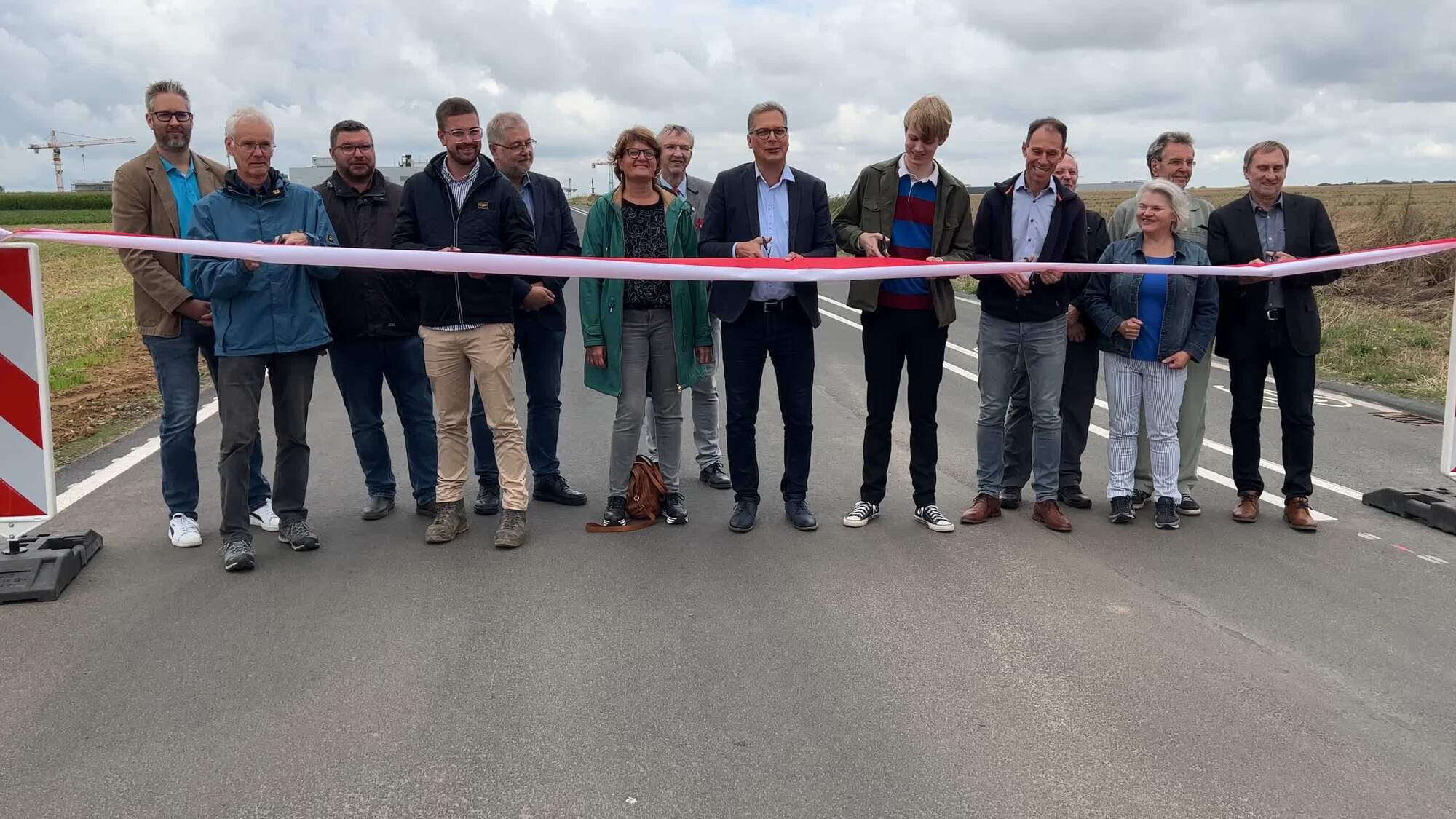 Mit dem Durchschneiden des symbolischen Bandes gaben Bürgermeister Ulf Hürtgen, der Beigeordnete Ottmar Voigt, Joachim Franzen (Geschäftsbereichsleiter Tiefbau) sowie Marvin Strick (Strukturausschussvorsitzender), Hendrik Weinberg (Blandfort Bau) und Heinz Kochs (Ingenieurbüro Dr. Jochims & Burtscheidt) die Straße nun im Beisein von Vertretern aus Politik und Verwaltung offiziell für den Verkehr frei.