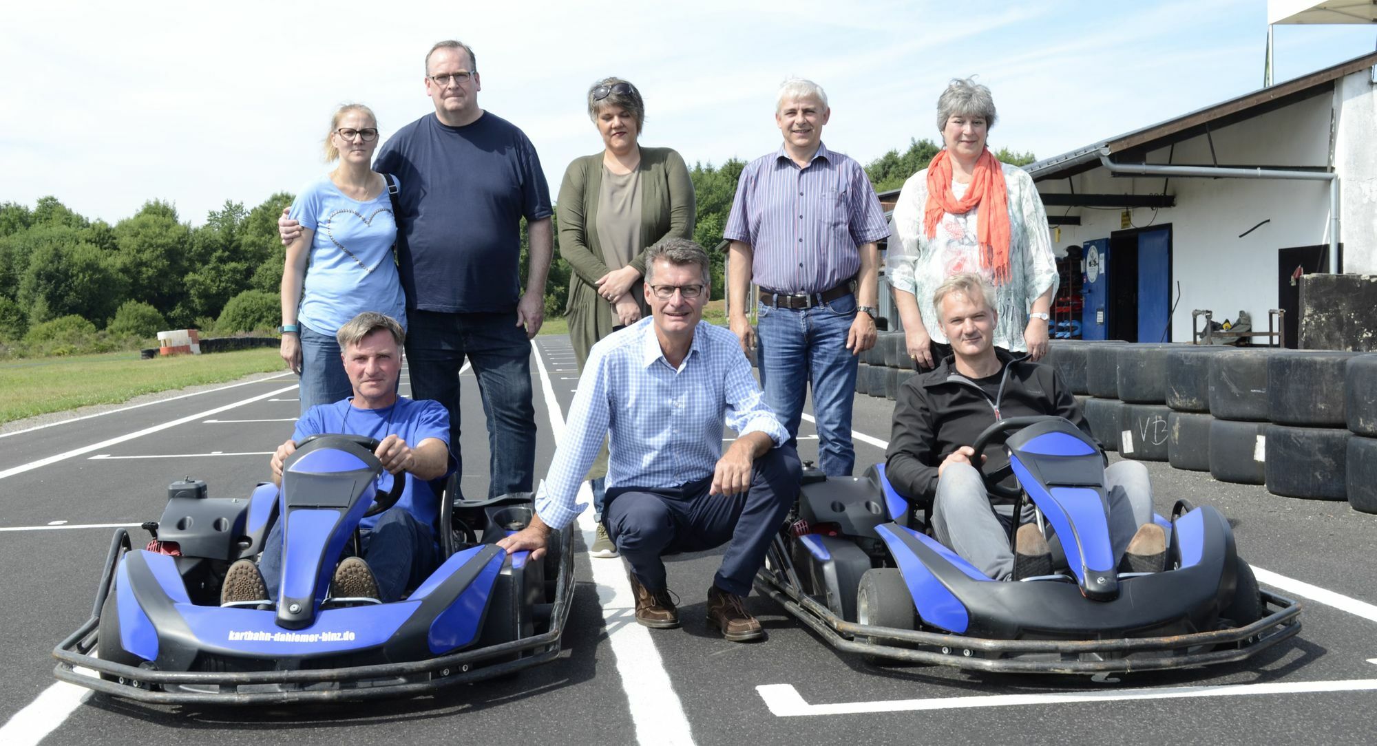 Richard Orphan, Jan Lembach und Christopher Merkel (vorne, von links) stellten mit Vertretern aus Politik, Tourismus und Gastronomie die neue Strecke der Kartbahn Dahlemer Binz vor. mn-Foto
