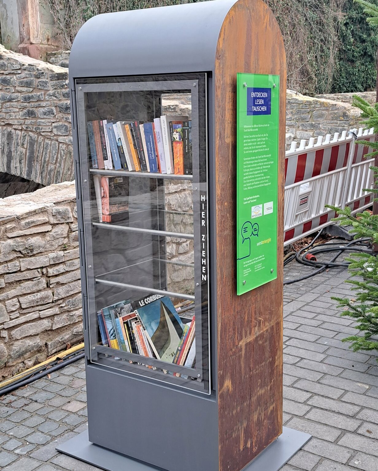 Die Mini-Bibliothek ist rund um die Uhr geöffnet, besteht aus wetterfestem Cortenstahl und fügt sich mit seiner schlanken Form leicht in den öffentlichen Raum ein. Die Türen schließen selbsttätig, so dass die Bücher immer vor Regen geschützt sind. Das untere Fach ist für Kinderbücher gedacht, damit die Kleinen die Bücher auch gut erreichen können. Ehrenamtliche Paten achten auf die Bücherschränke, sehen regelmäßig nach dem Rechten und sortieren Krimis, Romane, Sachbücher und Kinderliteratur passend ein.