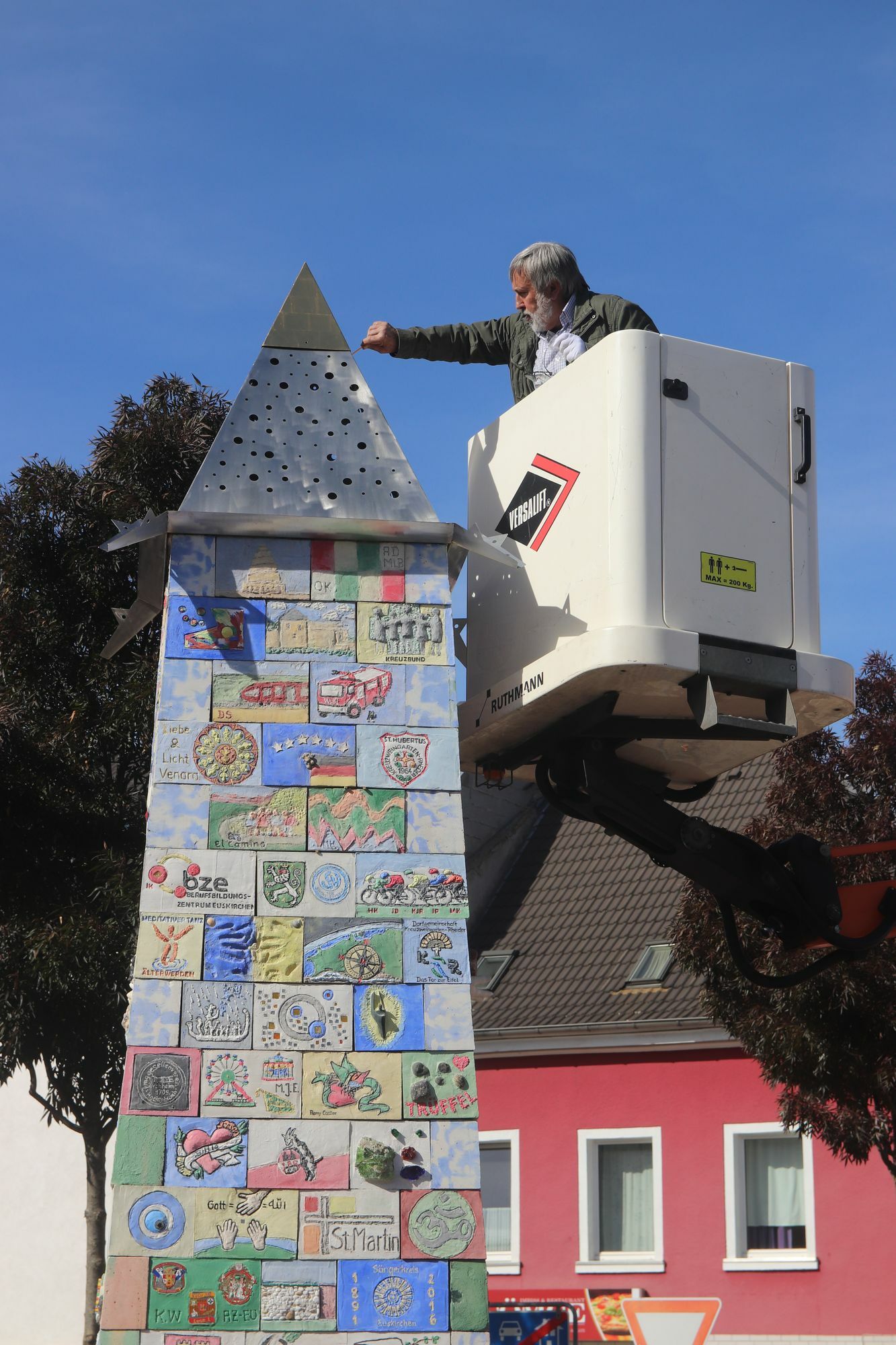 Sechs Meter hoch ragt das Kunstwerk über den Rüdesheimer Platz - die goldene Spitze wurde von Peter Hermes bei der Übergabe selber auf das Dach gesetzt. Der Obelisk besteht aus 300 Steinen, die über die Dauer von zwei Jahren von Hermes gefertigt wurden. 120 Spender beteiligten sich an der Aktion und ihre Vorstellungen wurden bei der Gestaltung ihrer Steine berücksichtigt. So entdeckt man die Logos von einigen Euskirchener Einrichtungen - beteiligt hatten sich unter anderem die Bundeswehr, die DLRG, die Kirchengemeinden, die Türkisch-islamische Gemeinde und viele mehr. Auch dabei sind die Wappen der Partnerstädte. Ziel des Projektes ist es, so Künstler Hermes, ein Zeichen für Solidarität und Toleranz zu setzen.