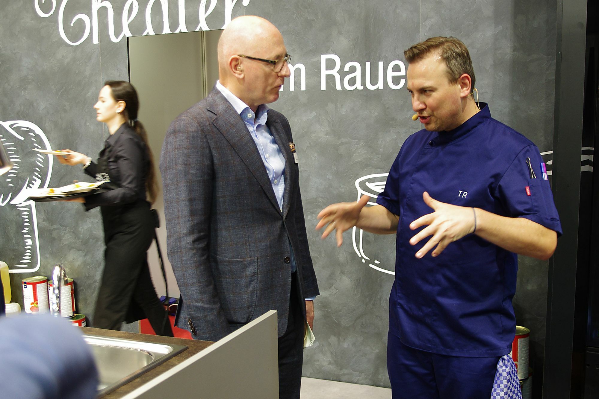 Auch die Spitzengastronomie arbeitet mit Produkten aus der Eifel: Auf der Internorga tauschen sich Sternekoch Tim Raue (re.) und Wolfgang Küpper, Marketingleiter der Papstar GmbH, über Vorzüge nachhaltigen Einmalgeschirrs aus. Foto: Papstar