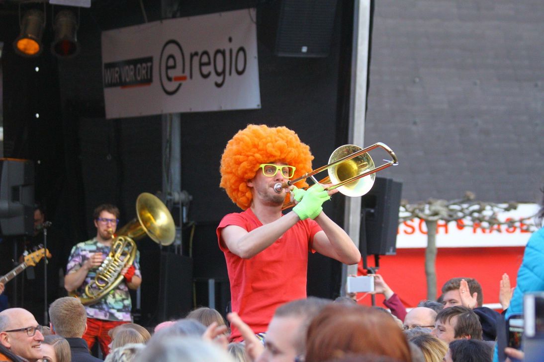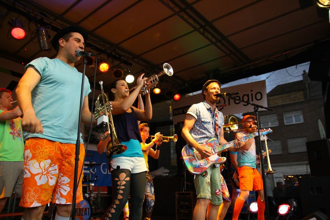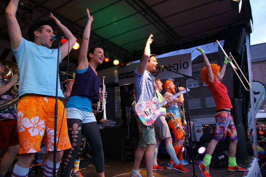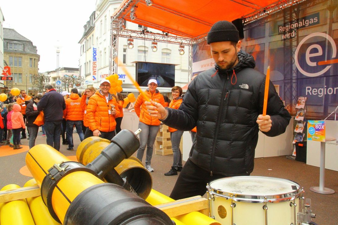 Der Samstag auf dem Euskirchener Stadtfest war ein voller Erfolg: Das angekündigte schlechte Wetter blieb aus und auf dem Alten Markt sorgten Querbeat, Kasalla und die Domstürmer für tolle Partystimmung. Wer einen Bummel durch die Stadt wagte, konnte sich auf dem Klosterplatz bei RVK, SVE und dem Busunternehmen Laschke über alles rund um den Euskirchener Busverkehr informieren. Vor dem Veybach-Center legten die Damen und Herren aus der Tanzschule Schumacher einige Tänze aufs Straßen-Parkett. Wer wollte, konnte beim Open-Air-Zumba oder bei der Mitmach-Polka einsteigen. Auch bei der e-regio ging es rhythmisch zu – Drummer Jan Schürheck, der eine Rolle im neuen Imagefilm des Energieversorgers spielt, trommelte auf der Bahnhofstraße auf einem Schlagzeug mit Gasrohren. Dazu stellte sich das frisch umgetauft Unternehmen in seiner neuen Farbe vor – dem knalligen Orange. Wer sich ein bisschen ausruhen wollte, konnte das am Stand der Offenen Zeltstadt tun – dort konnte man sich in die Hängematte legen und pausieren vom Shoppen und Bummeln. Ein weiteres Highlight im Kreisgebiet steigt an diesem Wochenende in Zülpich. Nach Bläck Fööss am Freitag und der Eröffnung von "Kunst im Schaufenster" laden die Fachgeschäfte heute von 13 Uhr bis 18 Uhr zum verkaufsoffenen Sonntags-Bummel ein. Die Immobilien- und Baumesse lockt am Sonntag in das Zelt auf dem Marktplatz, während sich die Karussells der Kirmes noch bis Dienstag am Kölntor drehen. (TN/SB) Fotos: Nolden