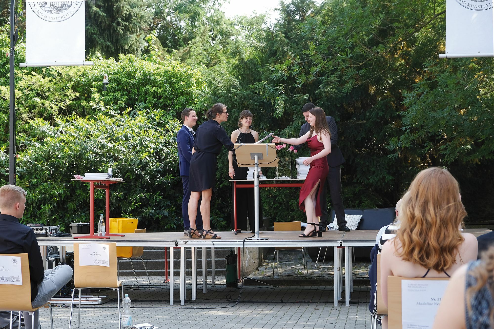 86 Schülerinnen und Schüler des städtischen St. Michael-Gymnasiums nahmen am letzten Tag des Schuljahres ihre Abiturzeugnisse entgegen. Unter Beachtung aller momentanen Vorgaben, konnte die Vergabe der Zeugnisse bei bestem Wetter auf dem Schulhof stattfinden. Auf den traditionellen Abiball mussten die Abiturientinnen und Abiturienten dieses Jahr verzichten. Eltern, Geschwister und Freunde konnten die Feierlichkeiten jedoch per Live-Stream verfolgen. An die Abiturfeier schloss sich das alljährliche Ausläuten an, eine Tradition, die das Ende der Schulzeit der Abiturientia besiegelt.